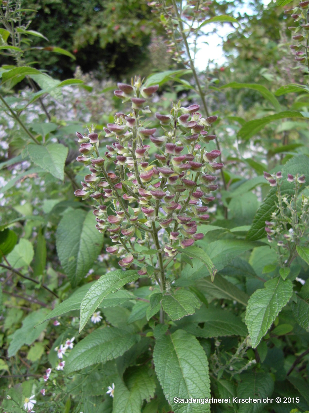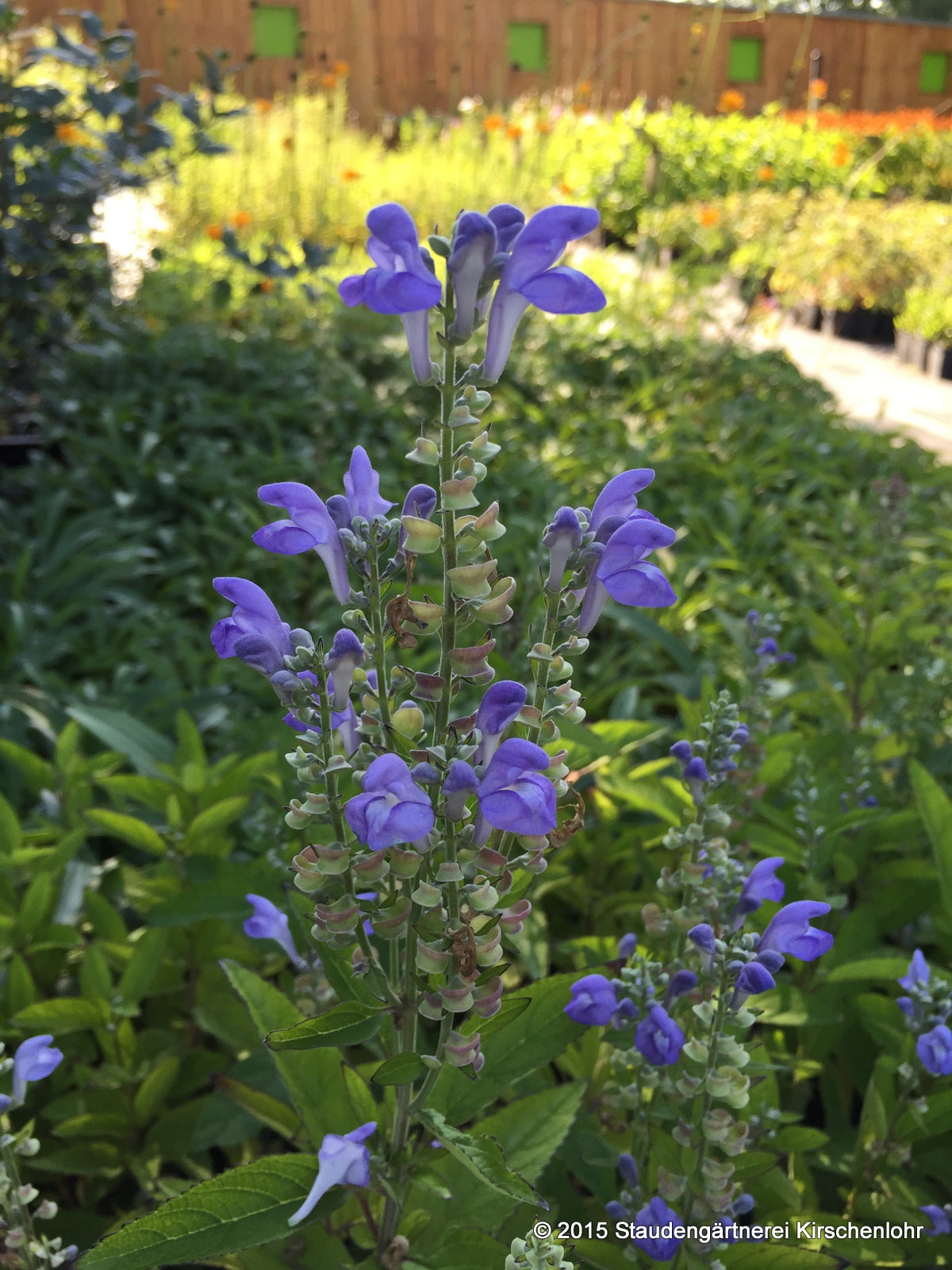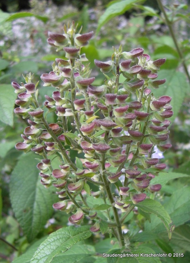 Hellblaue bis eisgraue, helmartige Lippenblüten, an vielblütigen, doldentraubigen, aufrechten Rispen. Ovale Blätter mit schwach gekerbtem Rand. Sommergrün.