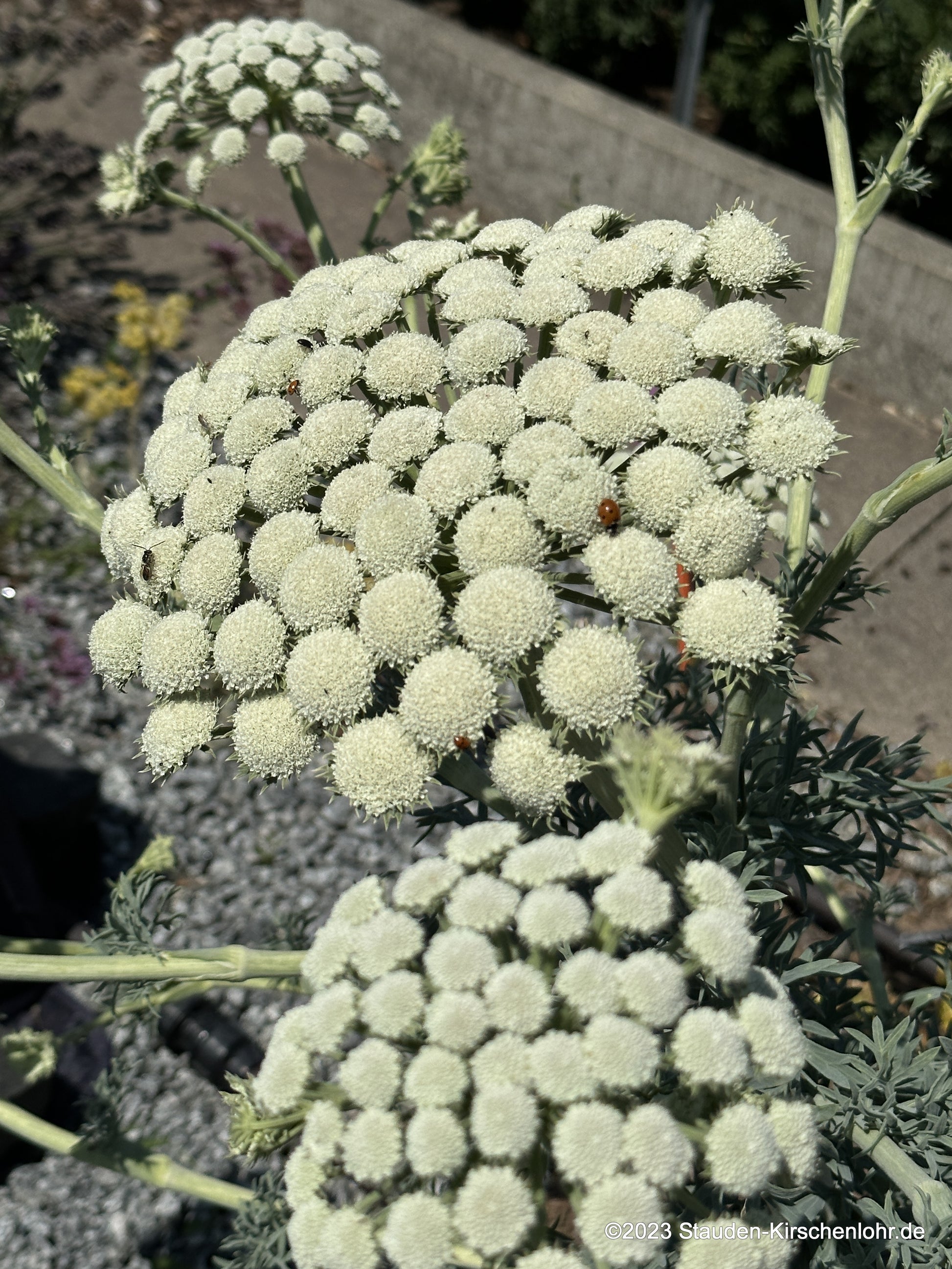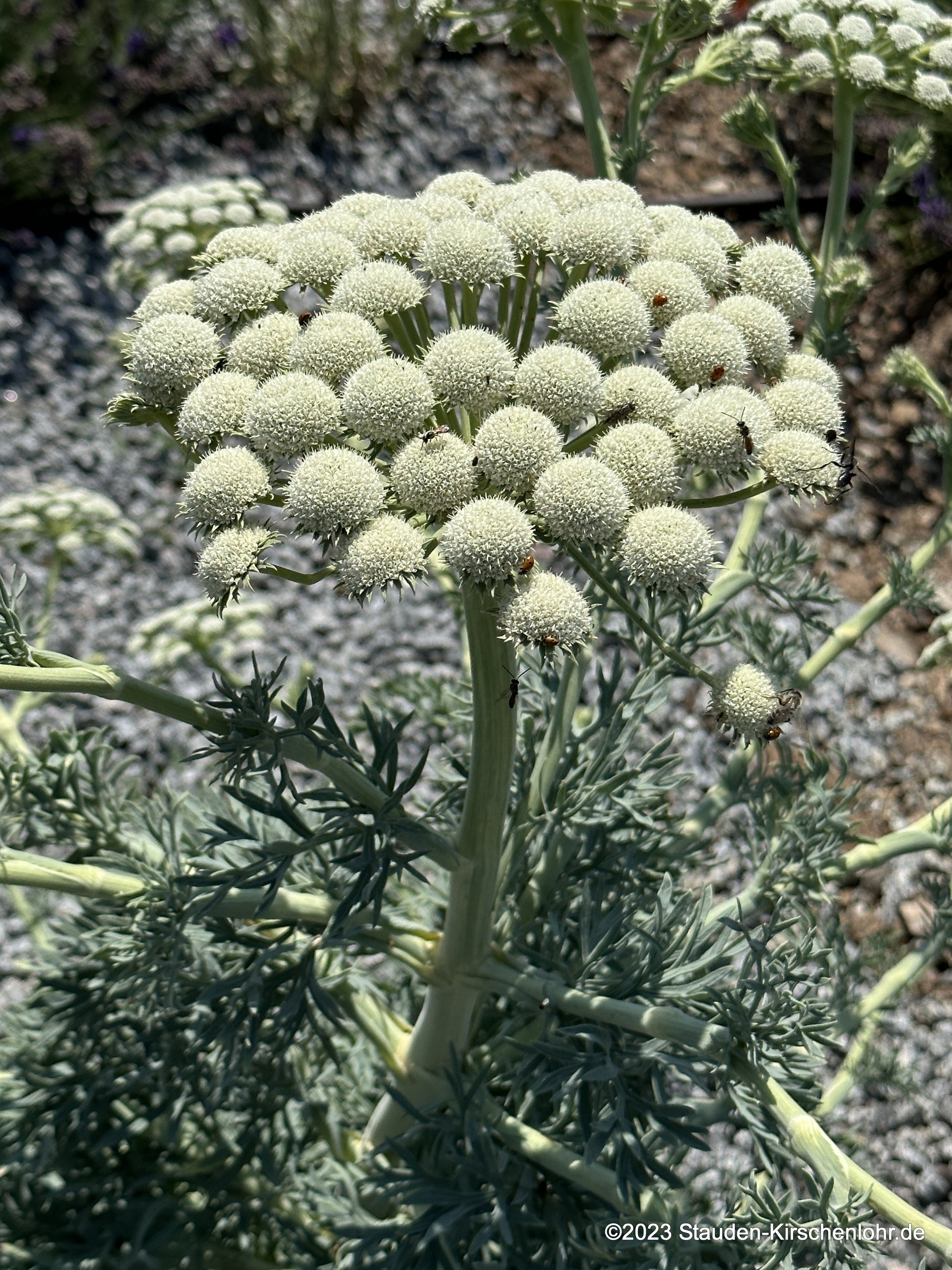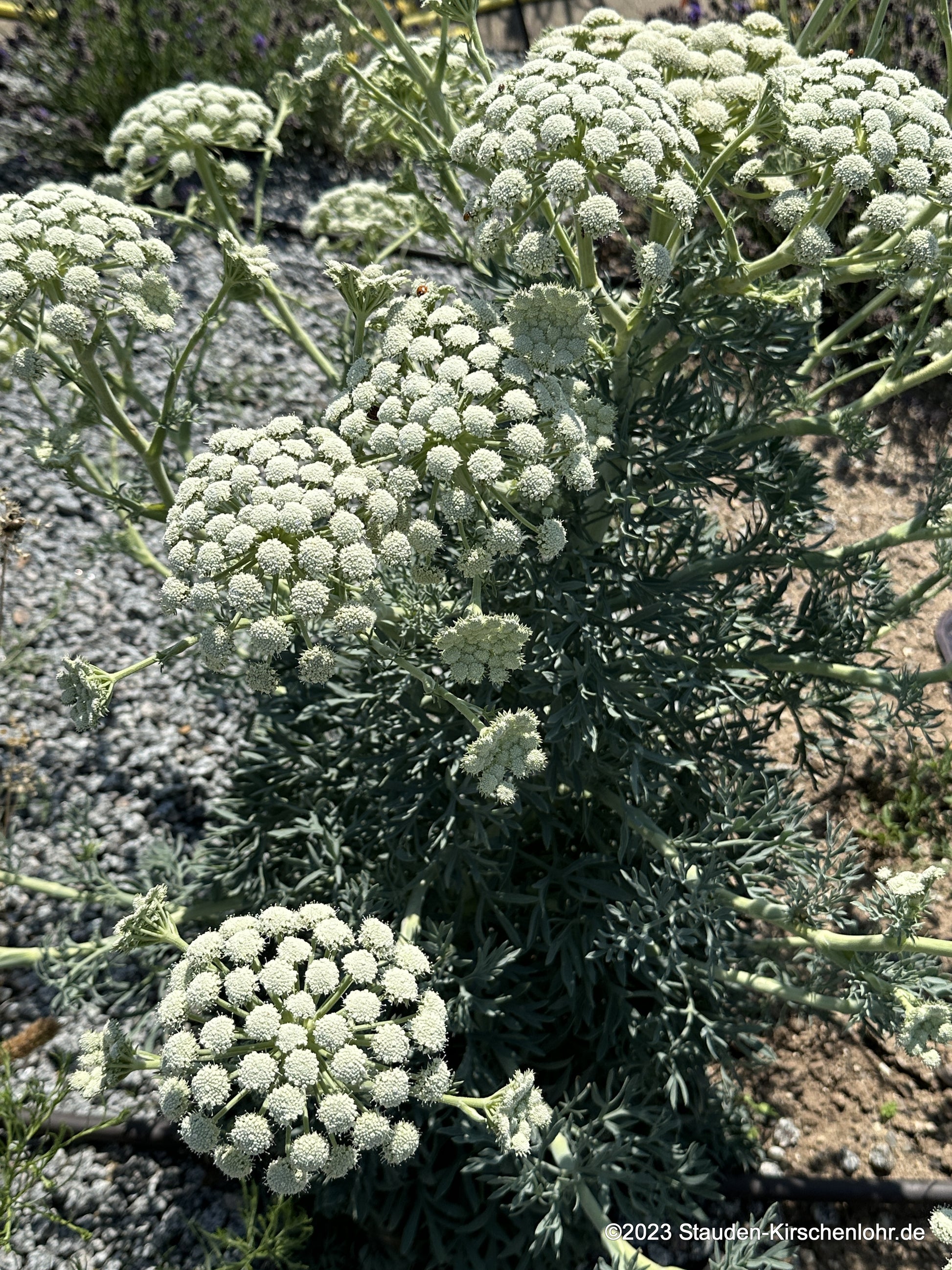 Cremeweiße Blütendolden sitzen auf zickzackförmigen Stängeln. Fantastisches, blaugraues, ledriges, gefiedertes Laub. Die mäßig langlebige Staude versamt sich am geeigneten trockenen Standort. Zweijährig! Bildet im ersten Jahr starre Rosetten.