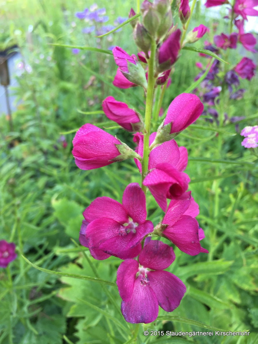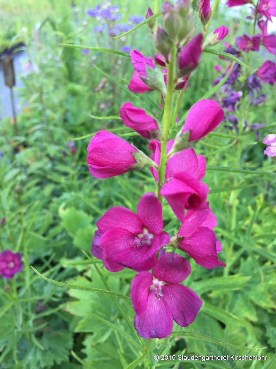Blütenblätter purpurrot, in aufrechten, langen, vielblütigen Trauben. Rundliche Blätter, Blattrand lappig eingeschnitten. Stängelblätter sehr variabel. Sommergrün.