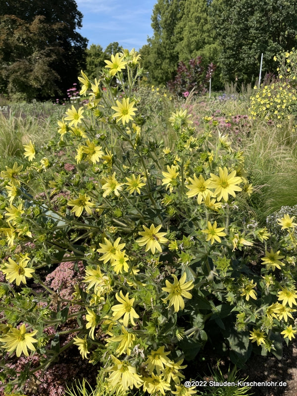 Hellgelbe Stahlenblüten stehen in locker verzweigten Rispen. Die Stängel sind fein behaart. Sommergrün.