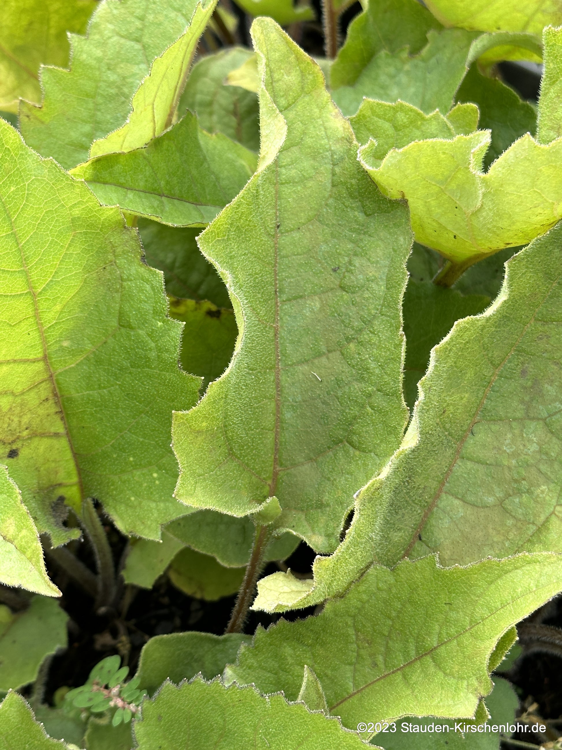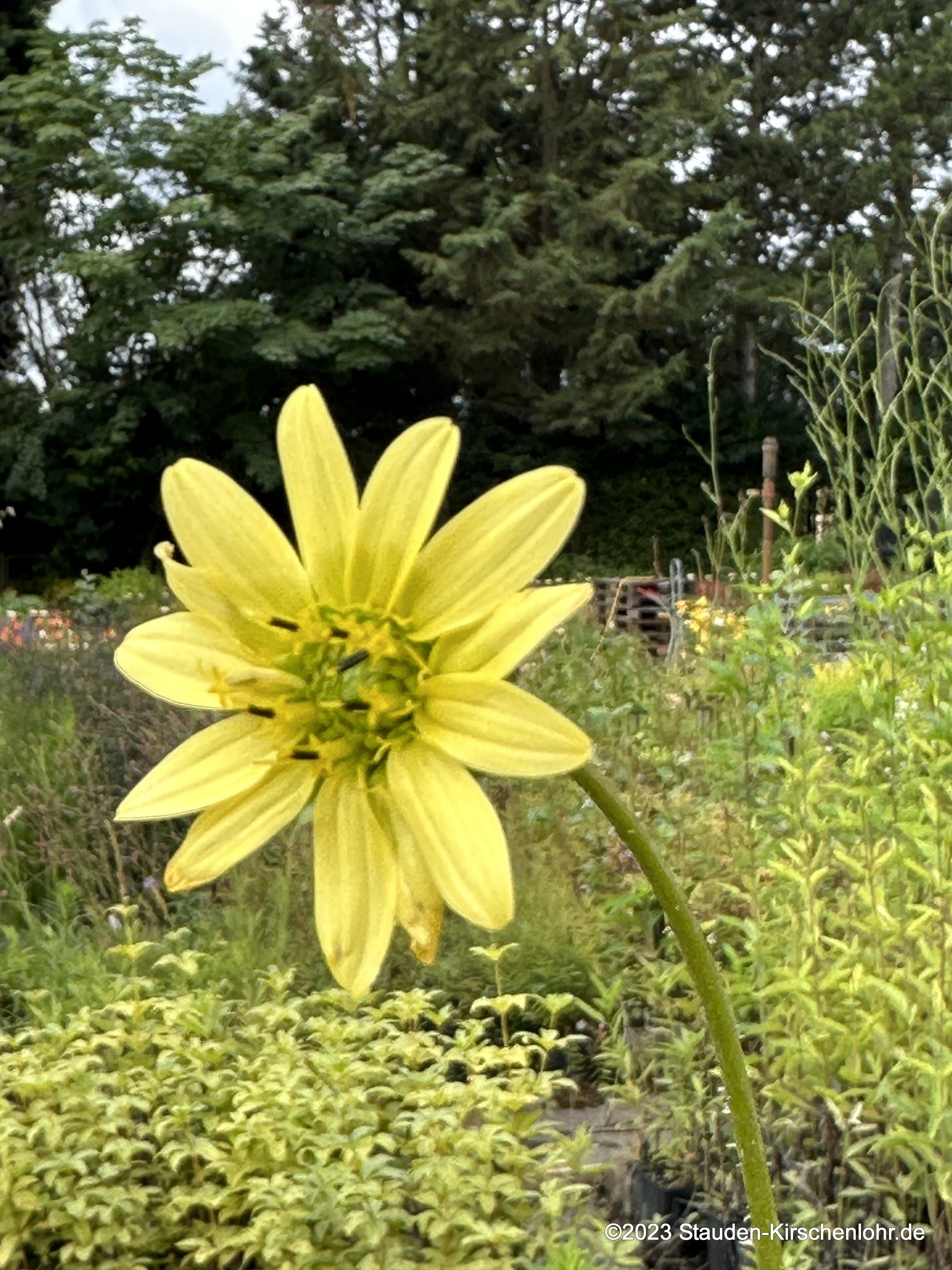 Hellgelbe, leicht überhängende Stahlenblüten, in locker verzweigten Rispen. Die Stängel sind fein behaart. Länglich ovale und stets glatte Blätter. Sommergrün.