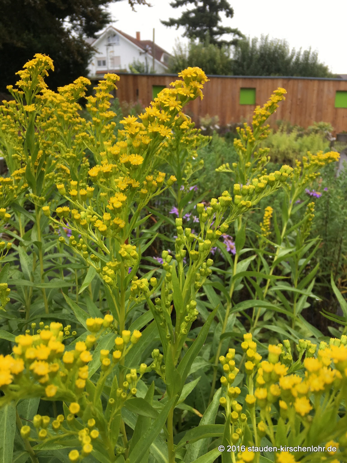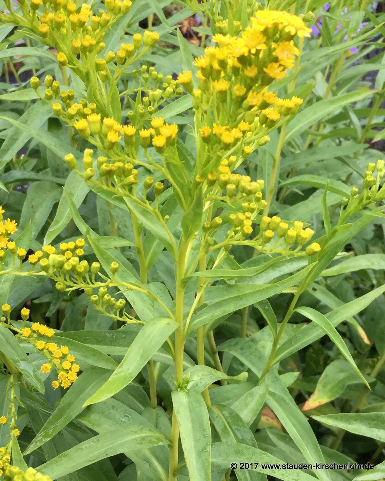 Körbchenartige, gelbe Blüten an rispigem Blütenstand. Breitlanzettliches Laub. Sterile Auslese von Robert Herman, Connecticut (USA). Halbwintergrün. Salztolerant.