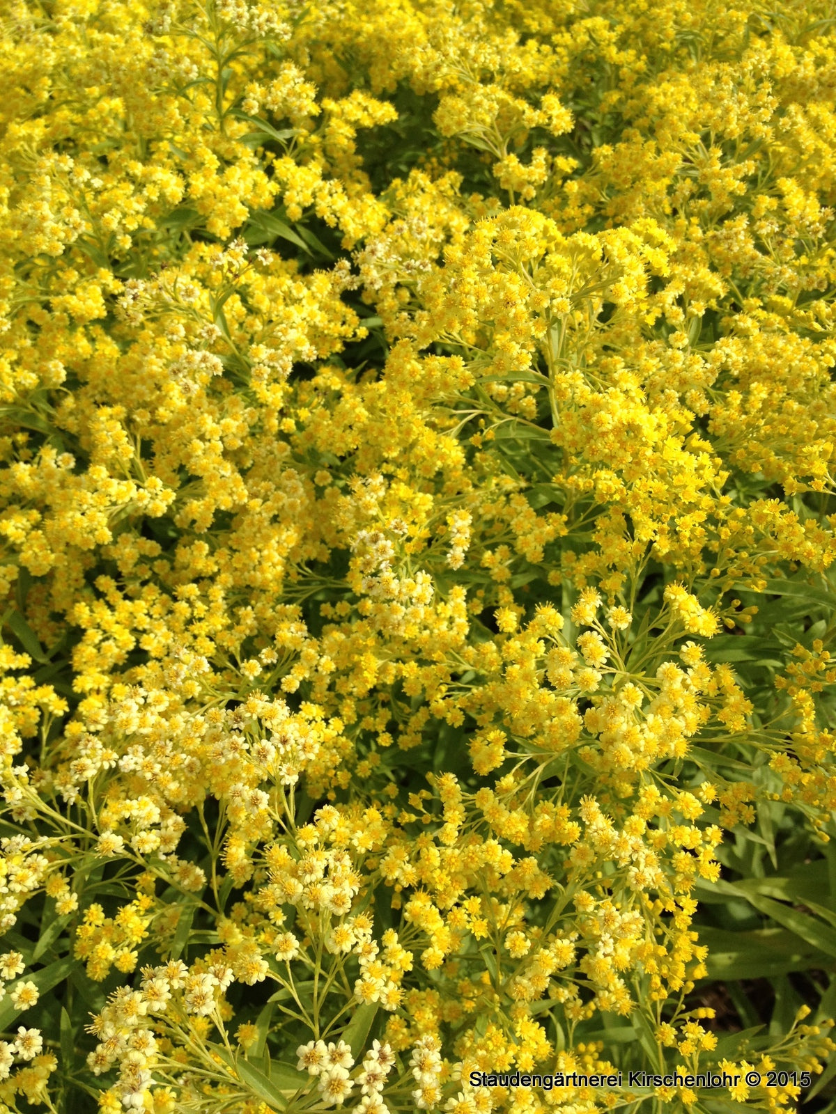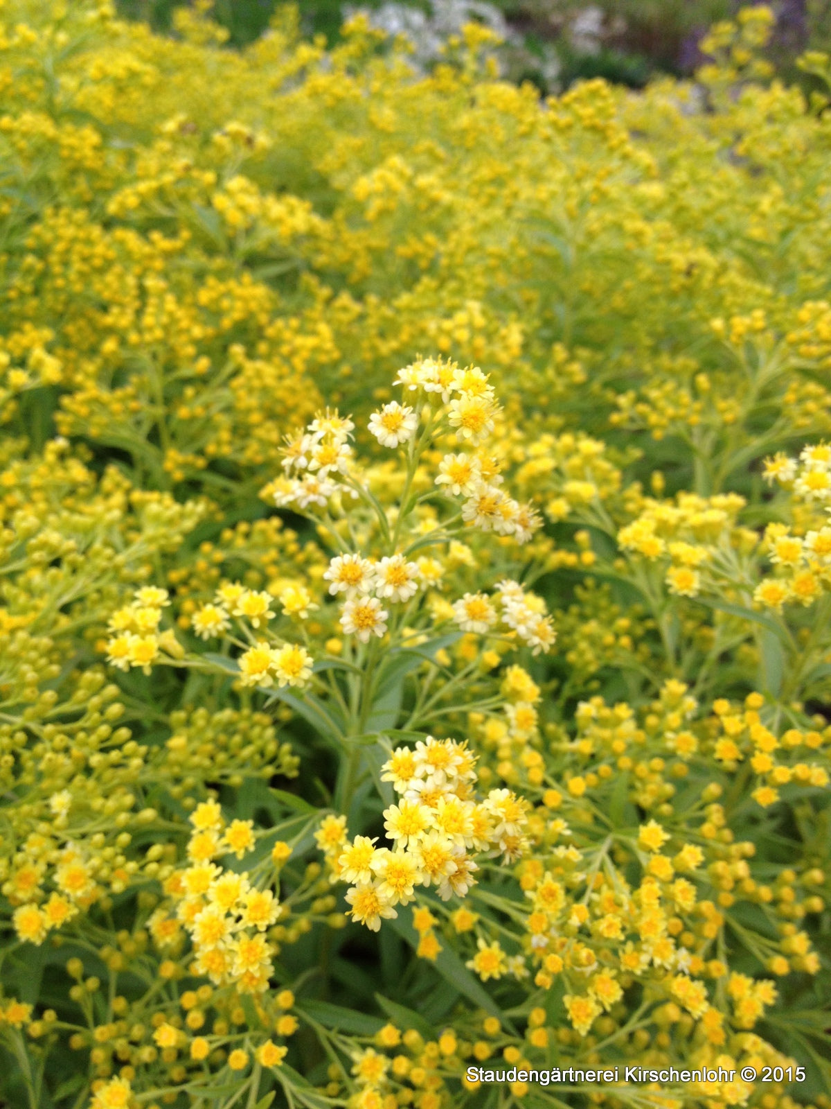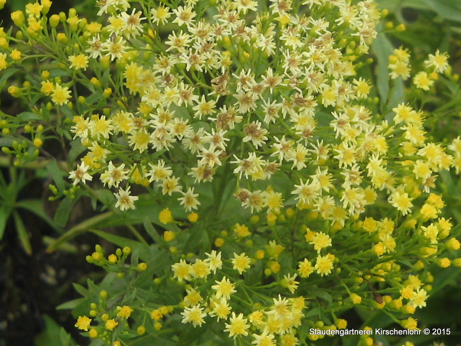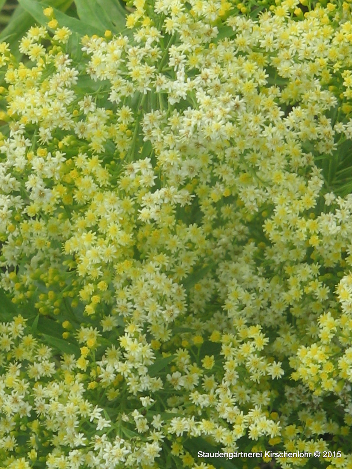 Wildasternhybride aus den USA. Blüht sehr reich mit zahlreichen, kleinen, hellgelben Blüten. Lanzettliche Blätter mit gezähntem Blattrand. Hervorragende Schnittblume. Steril! (syn. Solidaster l. L´). Ist eine Hybride aus S. ptarmicoides × S. missouriensis.