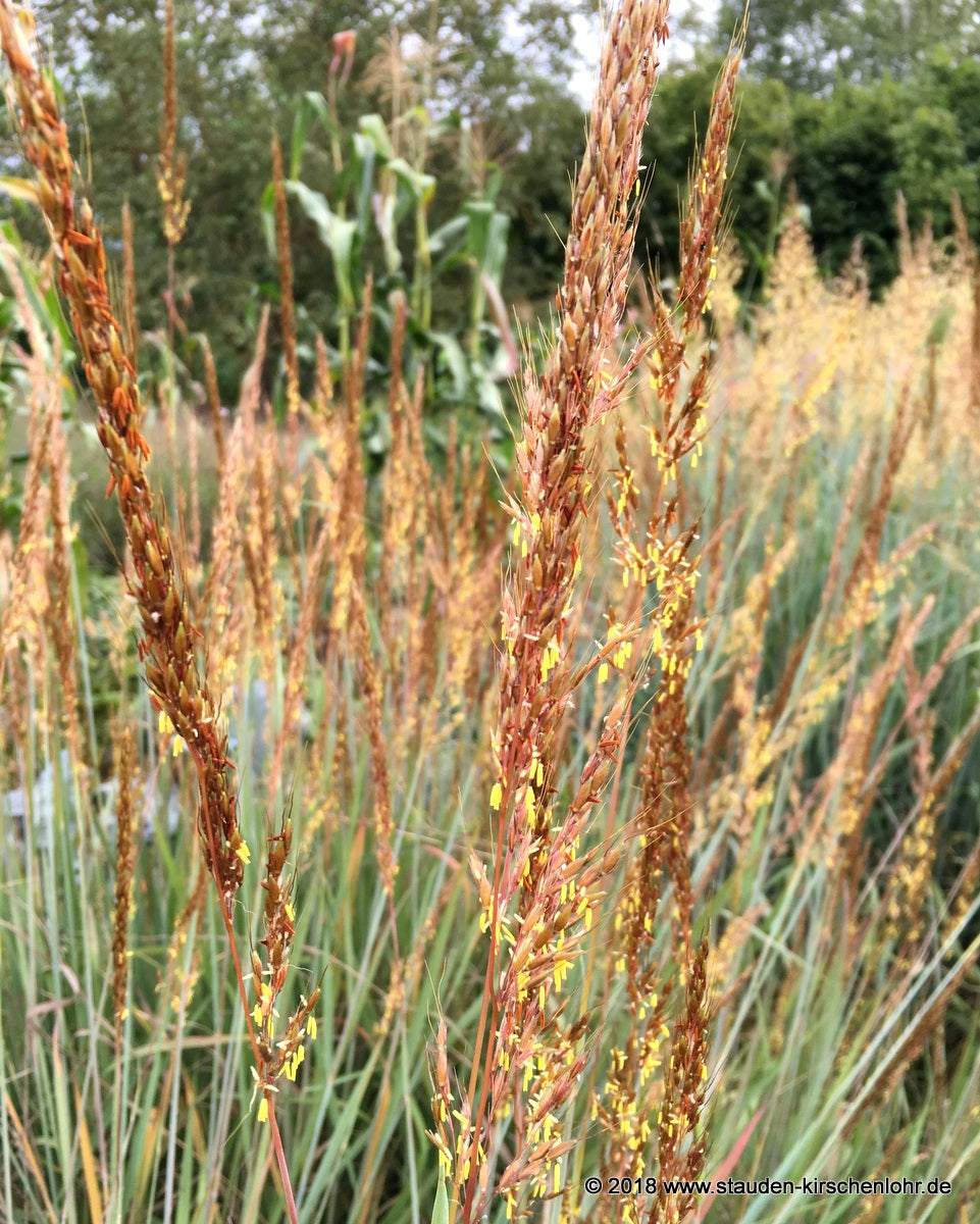 Eine Vielzahl von rotbraunen, aufrechten, schlanken Blütenrispen und goldgelben Staubgefäßen. Riemenförmiges, graublaues Laub. Sommergrün. Besonders schöne rot-gelbe Herbstfärbung.