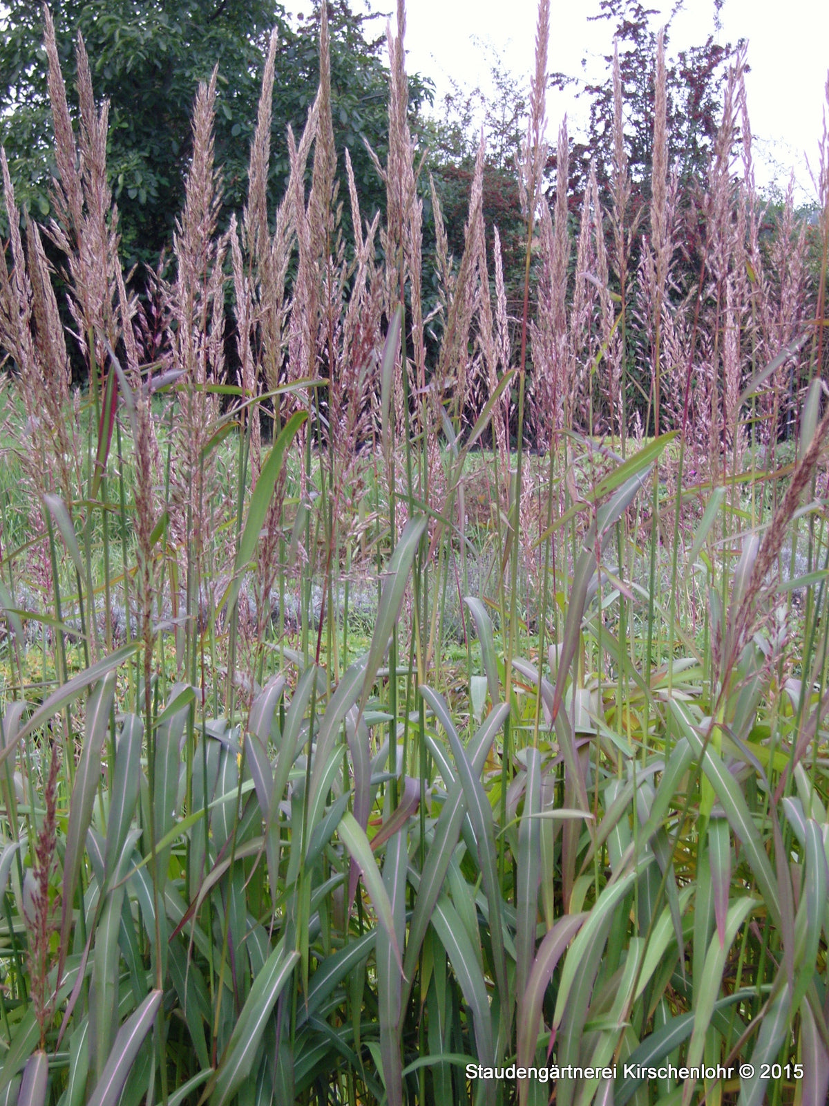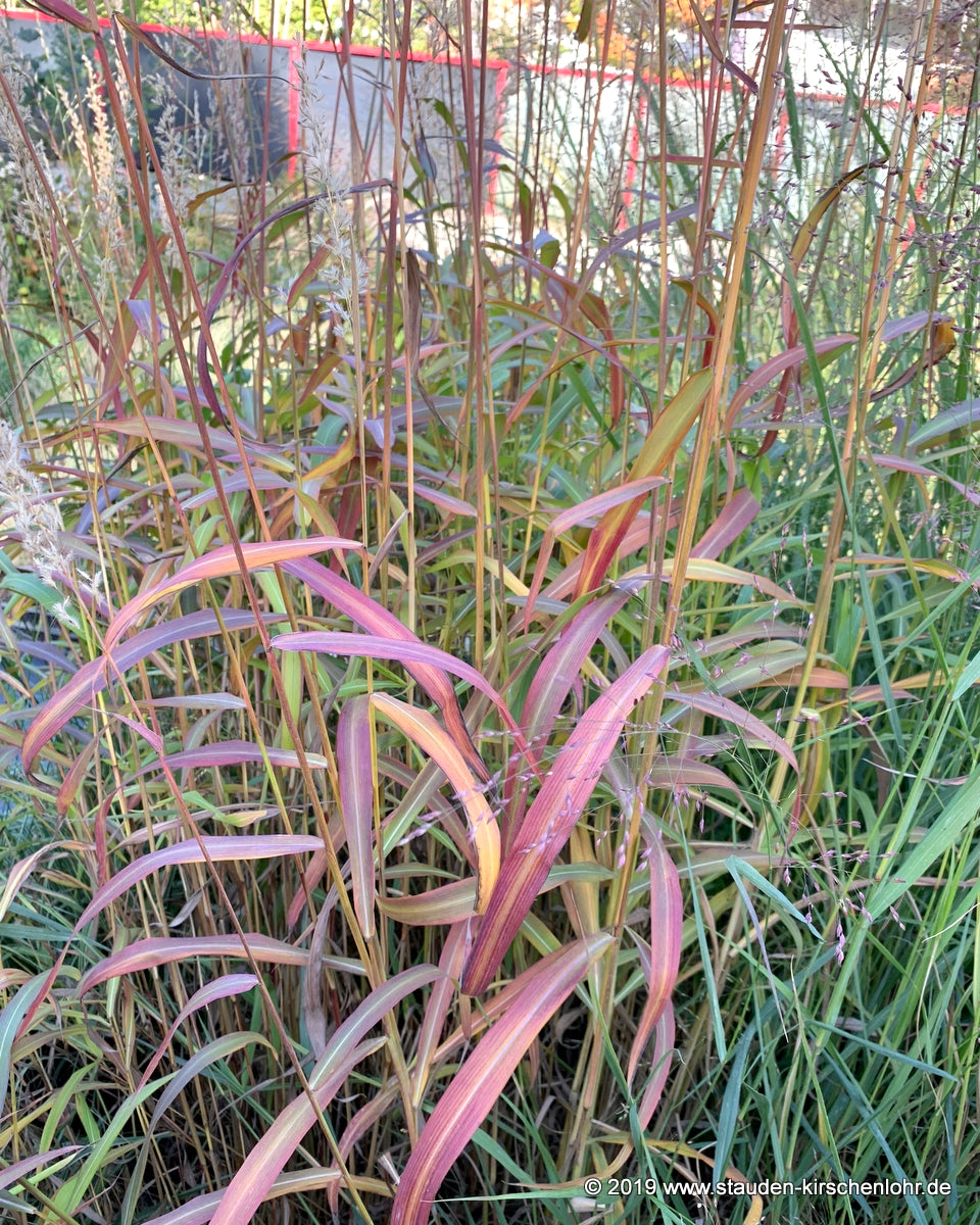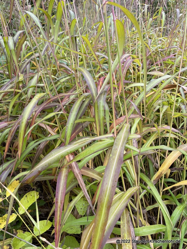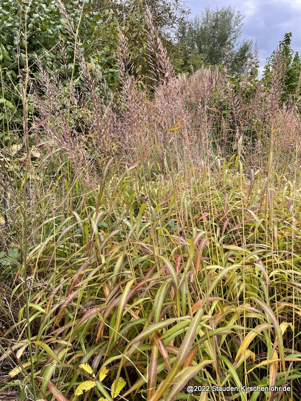 Blütenstand rispig, schmal, mit ästigen abstehenden, begrannten Ährchen. Purpurviolette Blütenstände. Relativ kurze, länglich zugepitzte Blätter. Wunderschöne rötliche Färbung im Herbst. Sommergrün.