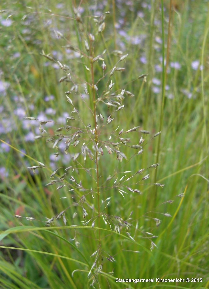 Tropfenförmige Ährchen in straff aufrechtem, rispigem Blütenstand deutlich über dem Laub. Lineales Laub. Besonders stark duftend. Leicht rötliche Stiele. Sommergrün. Bei uns als Klon, ausschließlich vegetativ vermehrt!