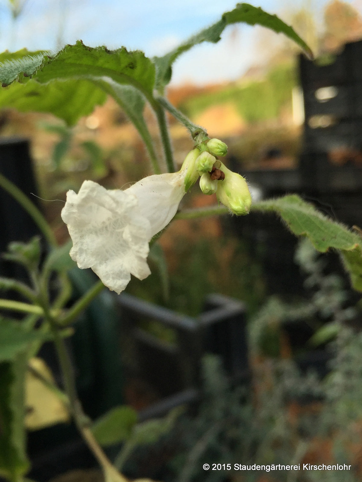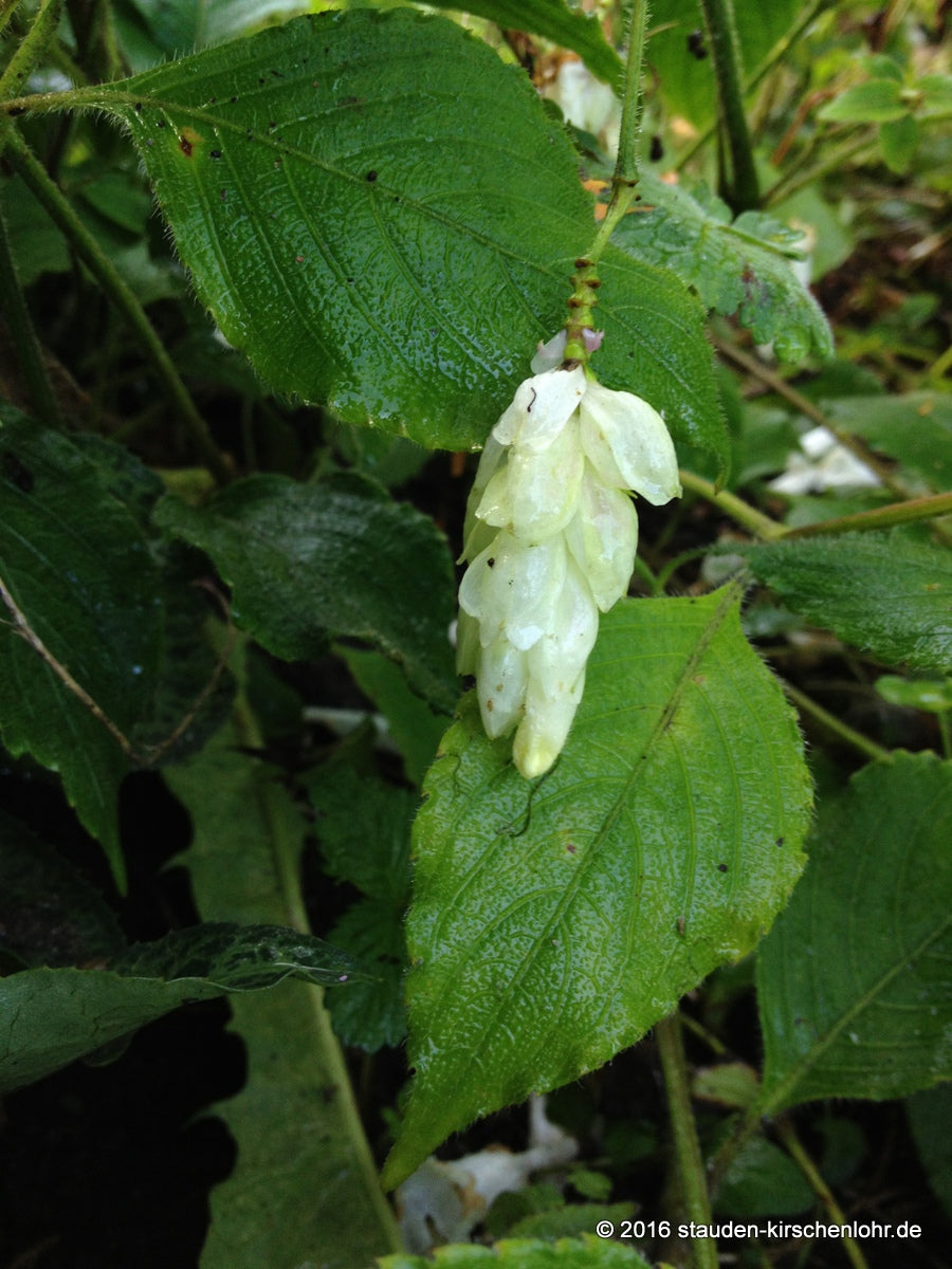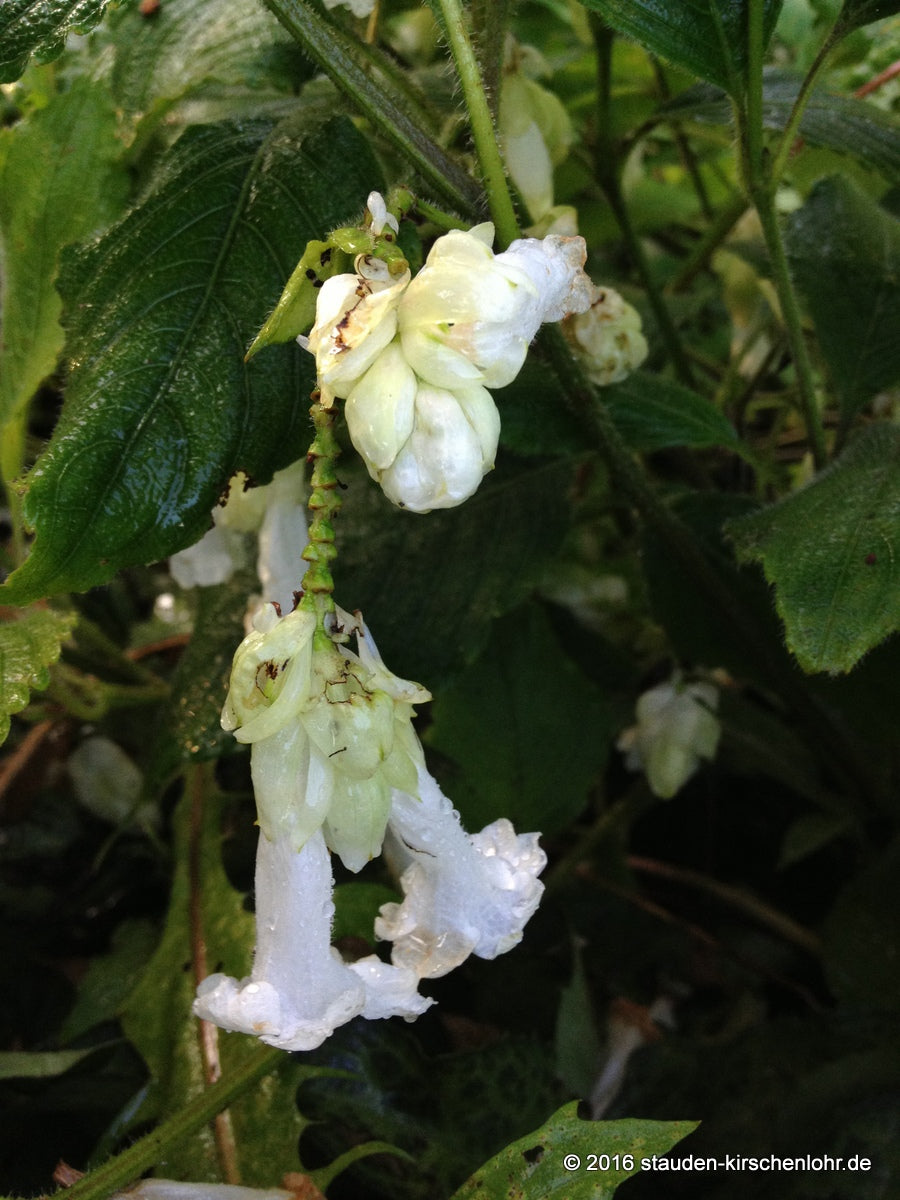 Cremeweiße, röhrenförmige Blüten. Die Blüten erscheinen aus einem schuppigen Blütenstand. Verzweigte Staude mit ovalem, weich behaartem Laub mit leicht gezahntem Blattrand. Sommergrün.