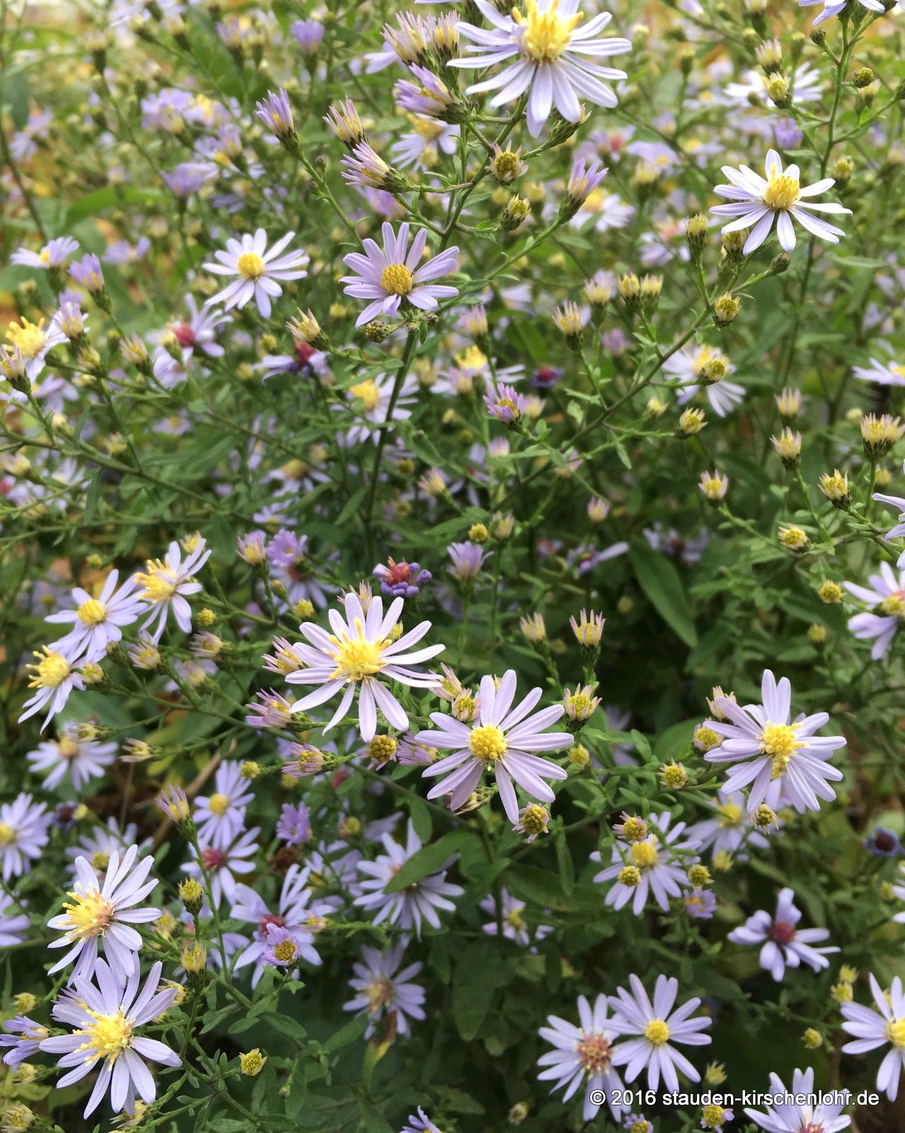 Kleine, hell-violettblaue Strahlenblüten auf stark verzweigten Stängeln. Lockeren Rispen wirken wie ein Schleier. Breites, herzförmiges Laub. Äußerst wertvolle Sorte. syn. A. cordifolius 'Photograph'