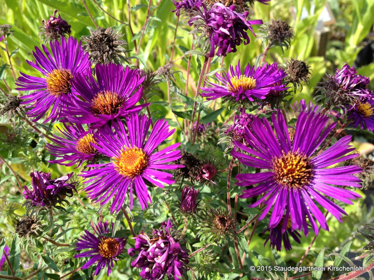 Unübertroffen in der Farbe ist diese Sorte mit auffälligen, leuchtend lachsrosa Strahlenblüten. Lanzettliches, fein behaartes Laub. Keine andere ist farblich vergleichbar. Gesund. Sommergrün. syn. Aster novae-angliae 'Andenken an Alma Pötschke'
