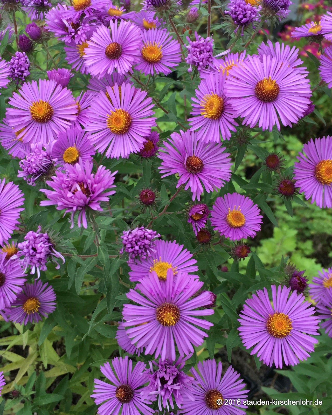 Sehr reichblühende Sorte mit fliederfarbenen Blüten. Ausgefallene Blütenfarbe. Lanzettliche, behaarte Blätter mit sehr geringer Krankheitsanfälligkeit. syn. Aster novae-angliae 'Herbstflieder'