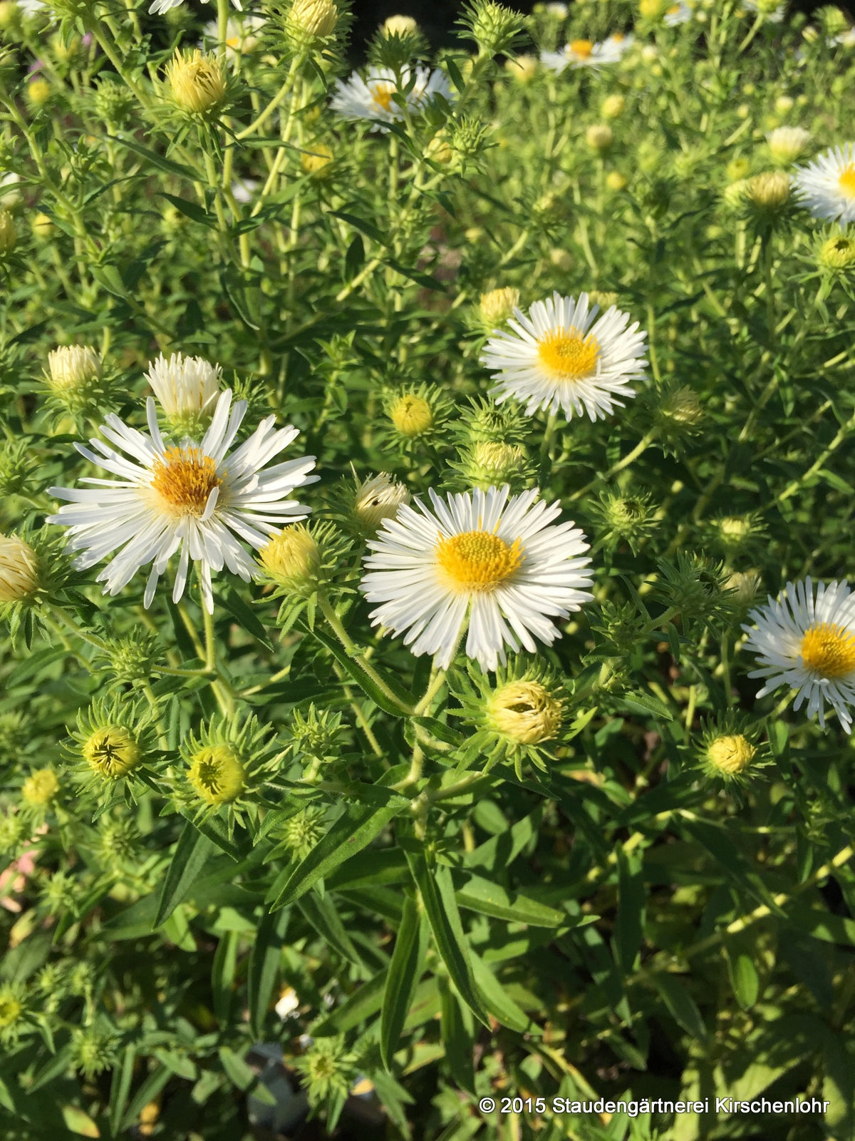 Weißblühende Sorte. Lanzettliches, fein behaartes Laub. sommergrün. Bei der Sichtung wurde 'Herbstschnee' mit sehr gut bewertet. syn. Aster novae-angliae 'Herbstschnee'