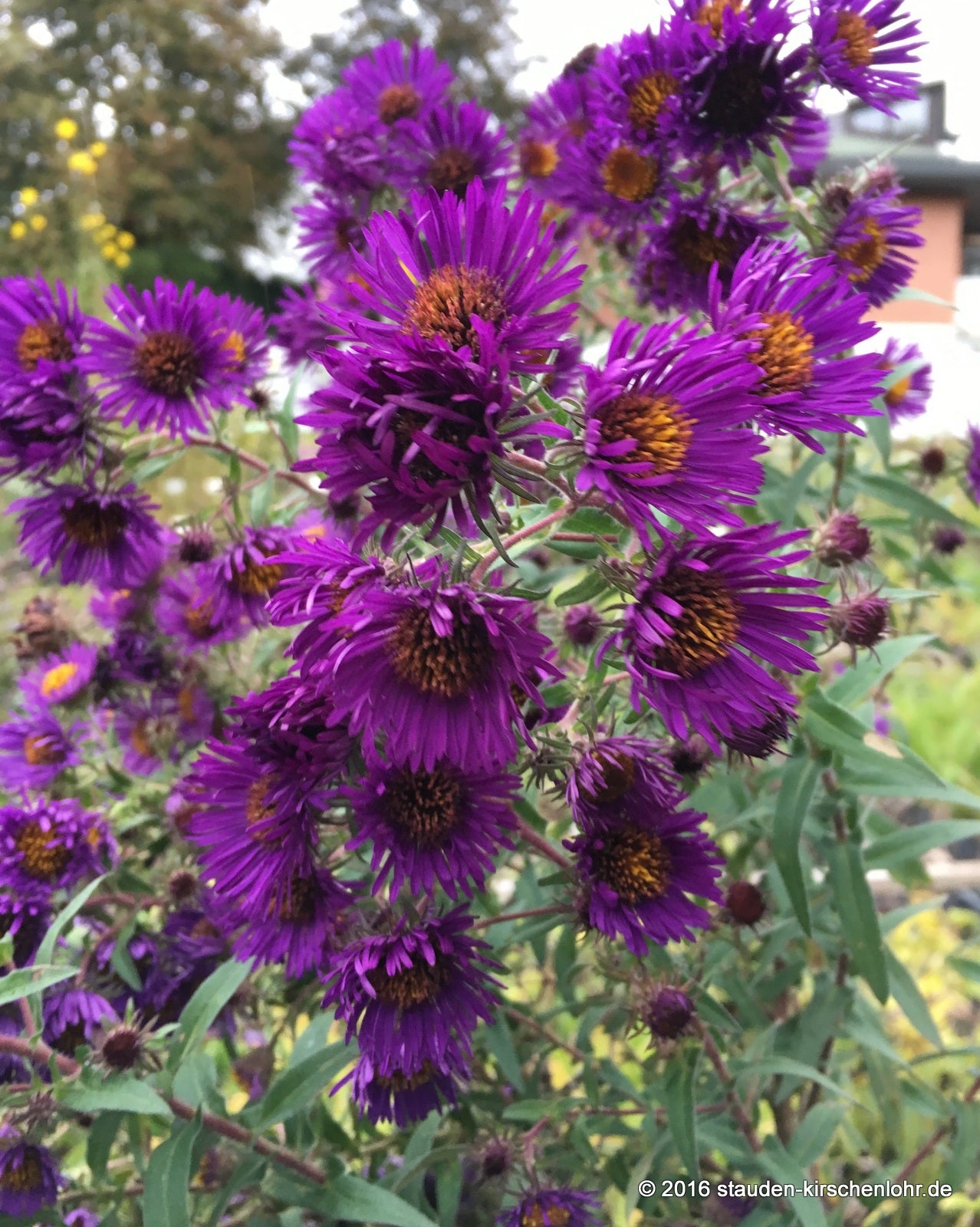 Tief violette Strahlenblüten. Lanzettliches, fein behaartes Laub. Keine andere ist farblich vergleichbar. Gesund. Sommergrün. syn. Aster novae-angliae 'Marina Wolkonsky'