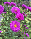 Blaustichig purpurrosa. Strahlenblüten mit auffällig gelber Scheibe. Reichblütig und sehr gut standfest. Lanzettliche, dunkelgrüne Blätter. Sommergrün. syn. Aster novi-belgii 'Karminkuppel'