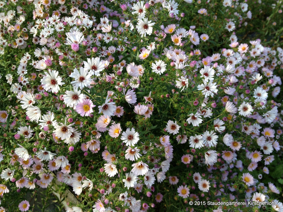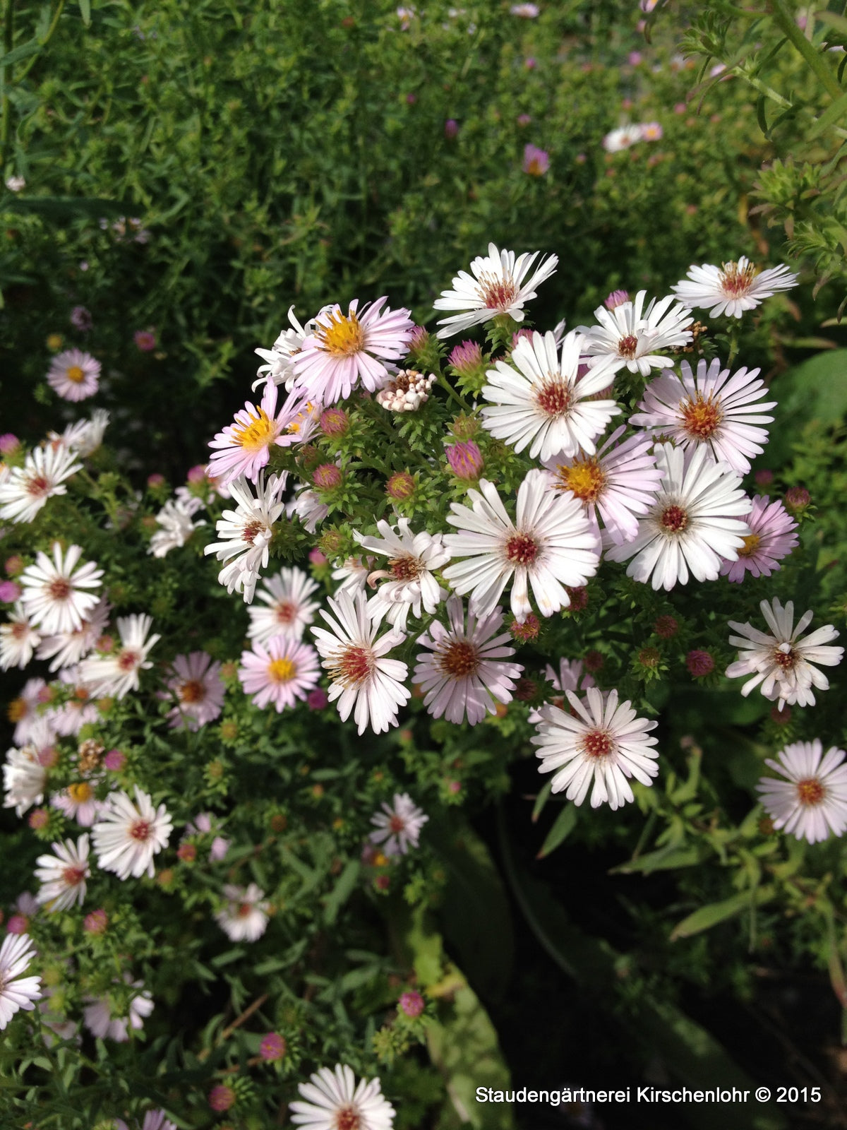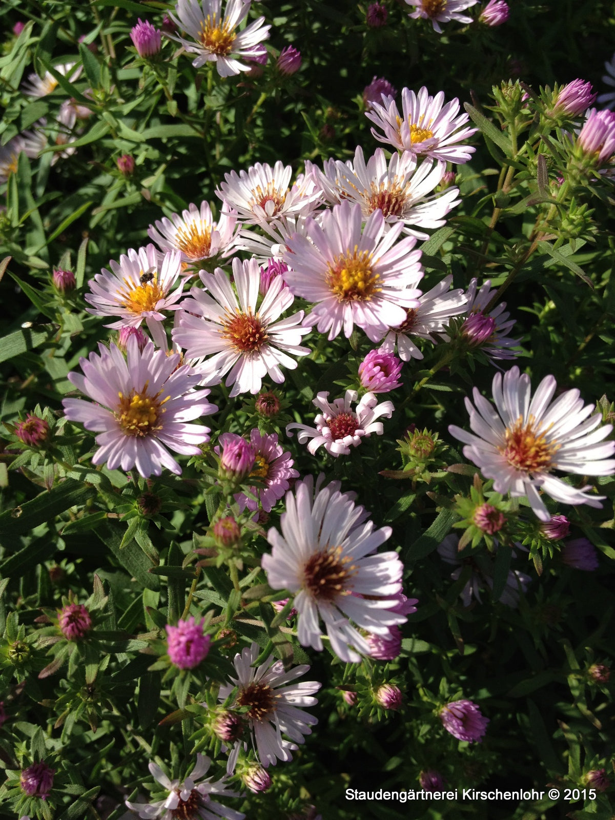 Kleine, zart violettrosa Strahlenblüten. Lineales, fein behaartes Laub. Äußerst reichblütige Sorte mit sehr guter Blütenschmuckwirkung und Standfestigkeit. Sommergrün. syn. Aster x amethystinus 'Kylie'