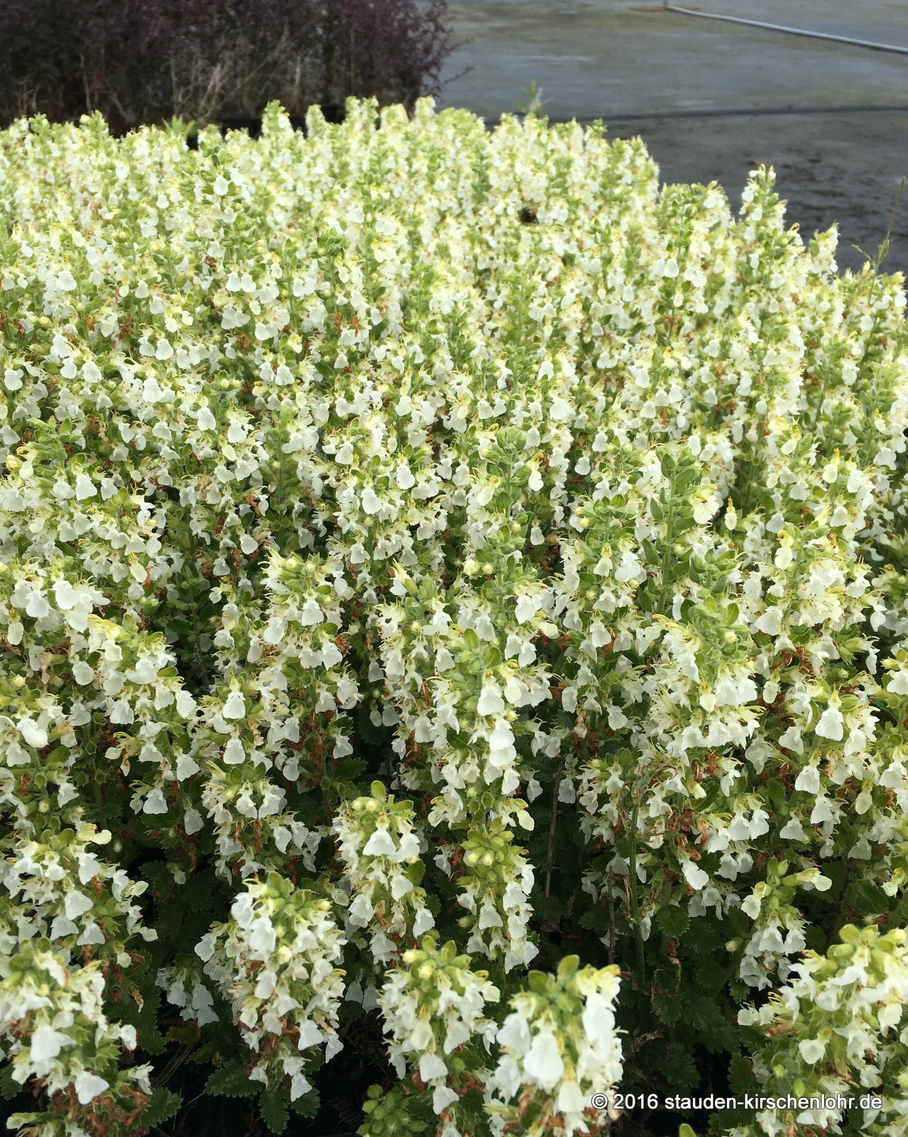 Weiße Lippenblüten in aufrechtem traubigem Blütenstand. Triebe am Grunde etwas verholzend. Ovale, gekerbte Blätter, matt- bis glänzend-grün. Sommergrün bis halbwintergrün. Ausläuferbildend.