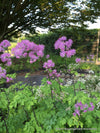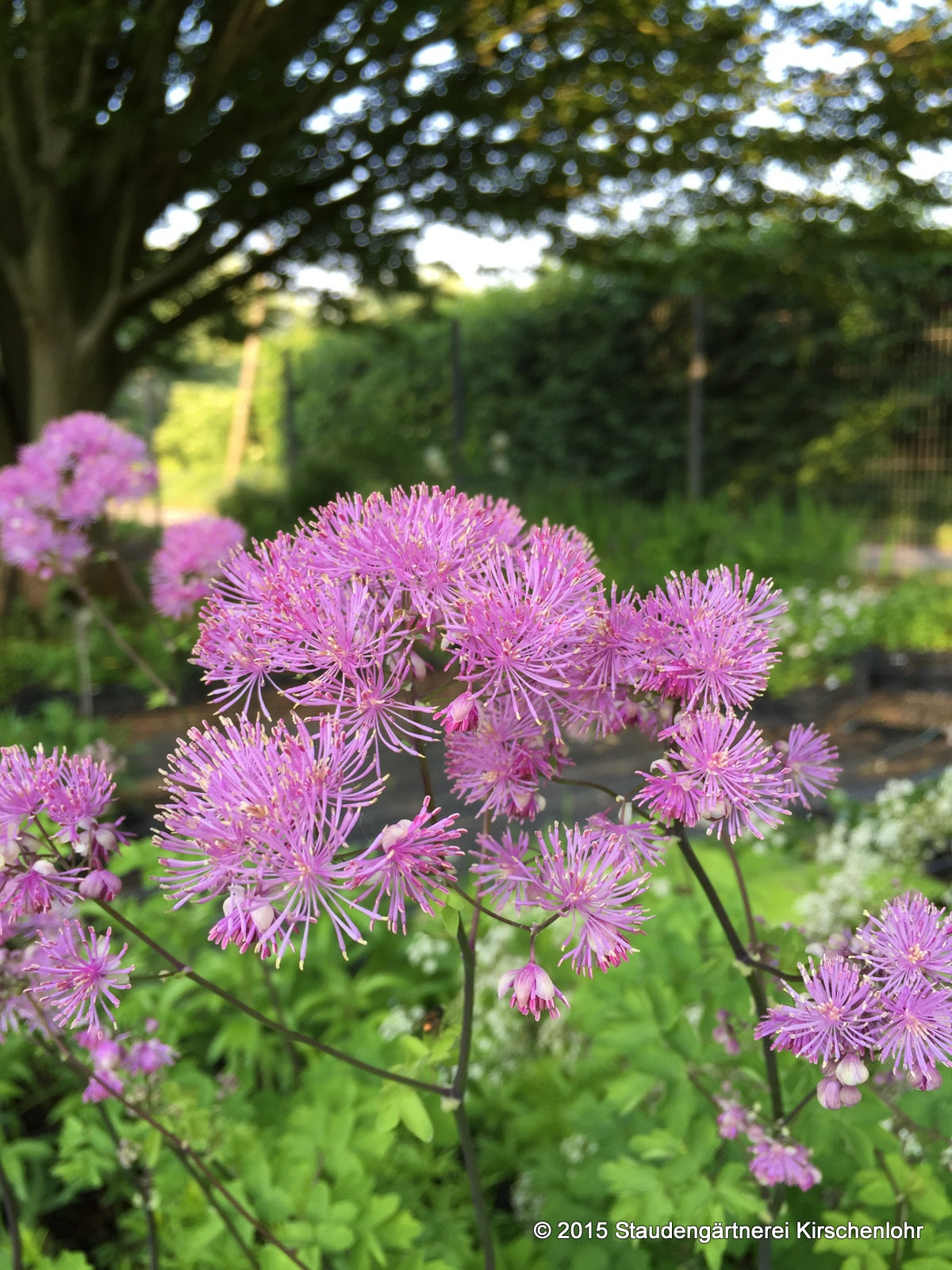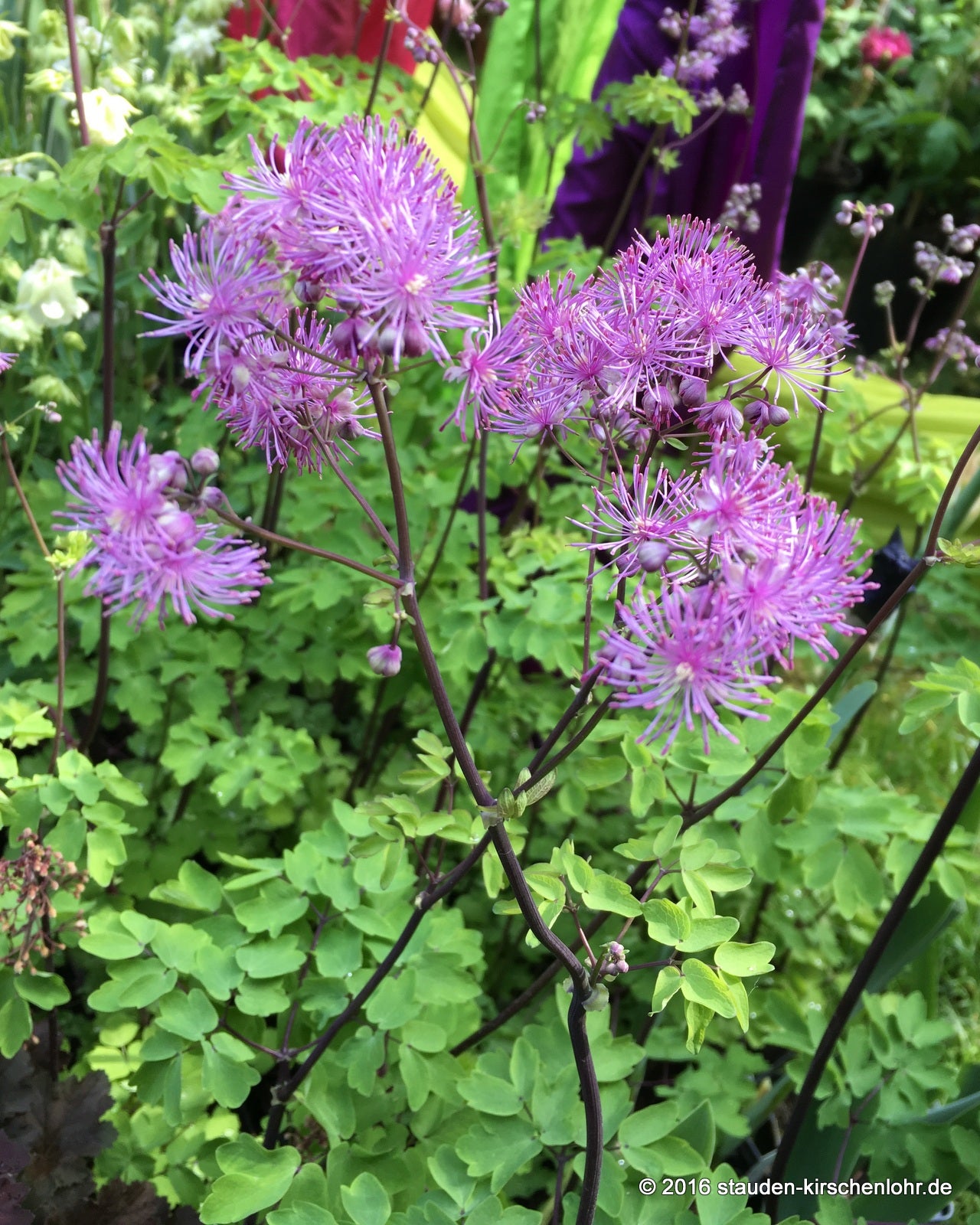 Eine Vielzahl von violetten, dicht angeordneten Staubgefäßen. Diese wirken locker und fedrig. Die Sepalen sind eher unscheinbar. Schwarze Stängel. Gefiederte, grüne Blätter mit leicht bläulichem Schimmer.