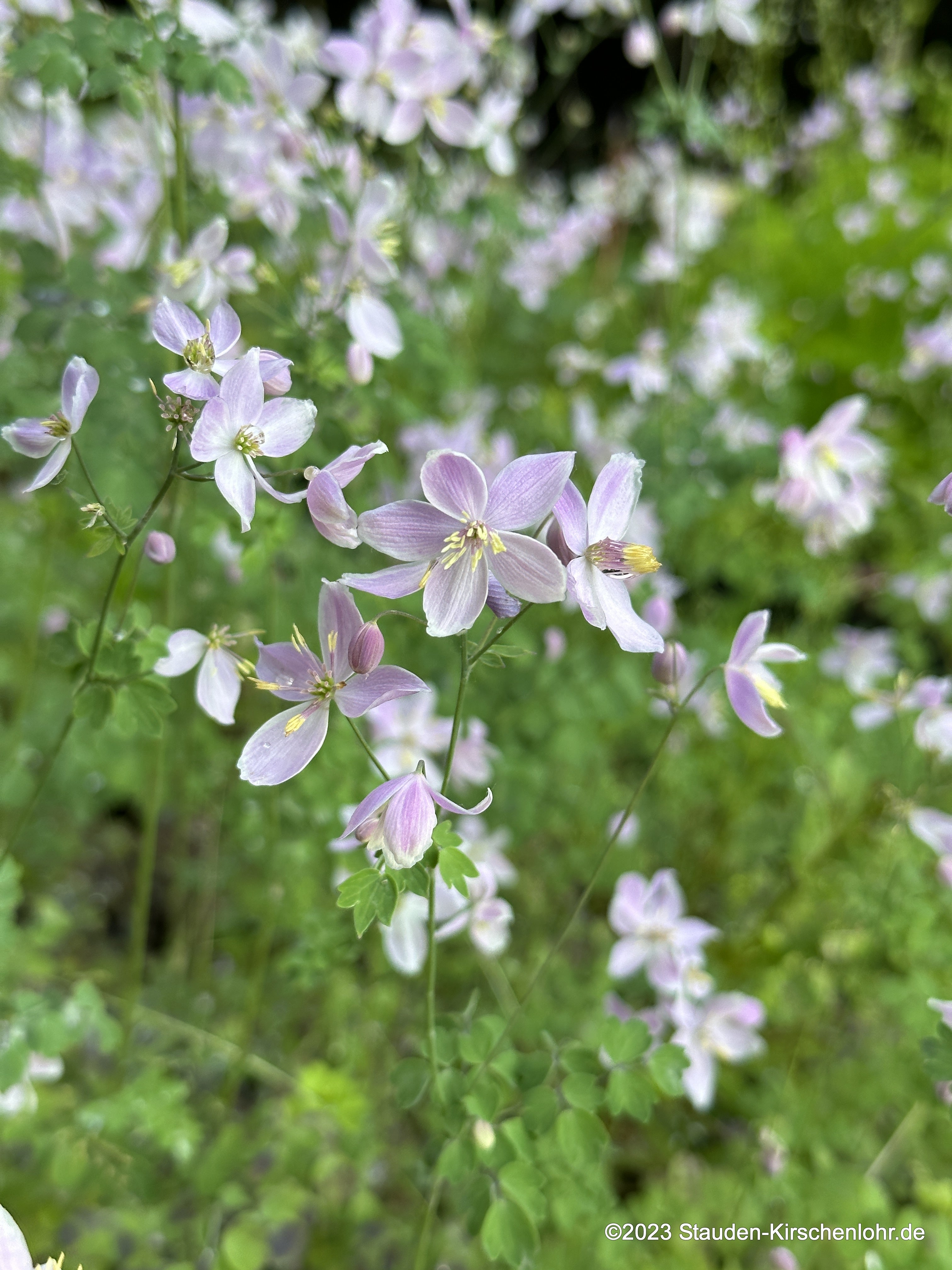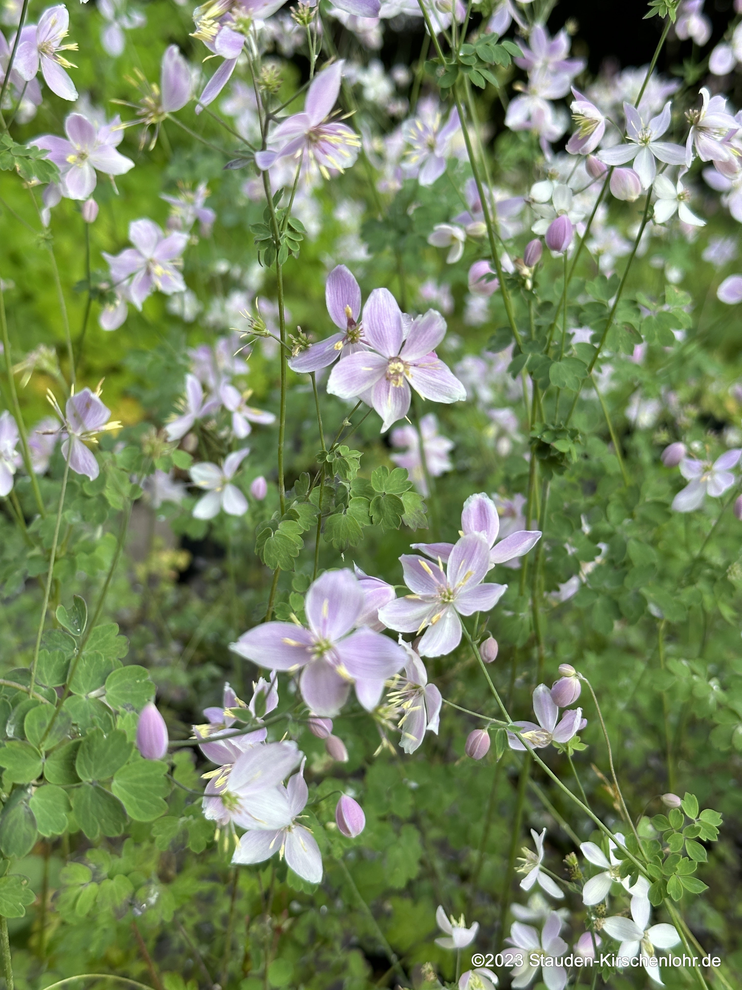 Traumhafte, zartviolette, große Blüten, die jeweils durch ein Zentrum aus blasslimonenfarbenen Staubblättern hervorgehoben werden. Diese Staubblätter wirken wie Wimpern. Kompakte Pflanze. Feines, akeleiartiges Laub. Wurde von der RHS zur Pflanze des Jahres gekührt (Chelsea Flower Show 2020). Sommergrün.