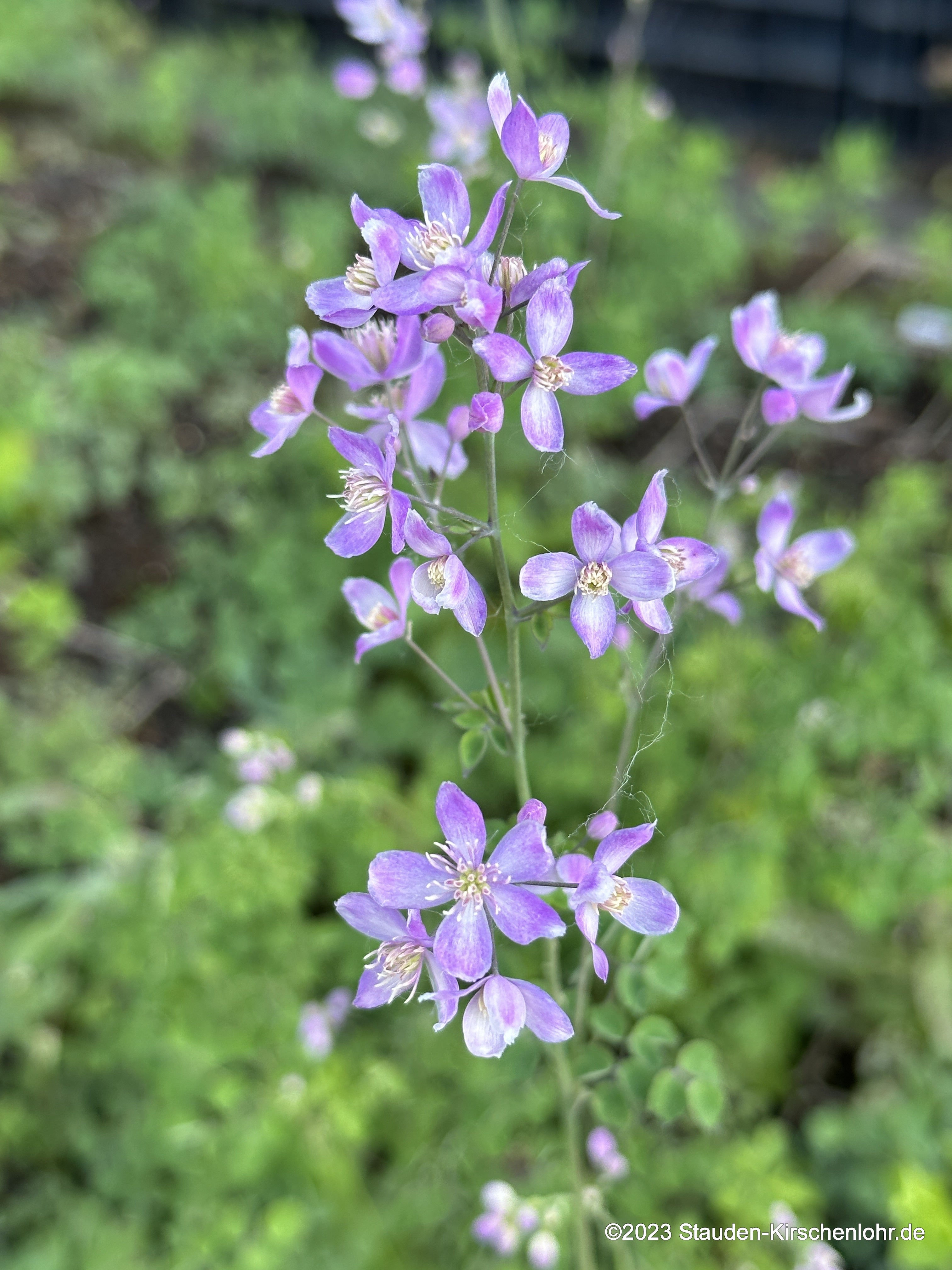 Traumhafte, violette Blüten mit blasslimonenfarbenen Staubblättern. Kompakte Pflanze. Feines, akeleiartiges Laub. Sommergrün.