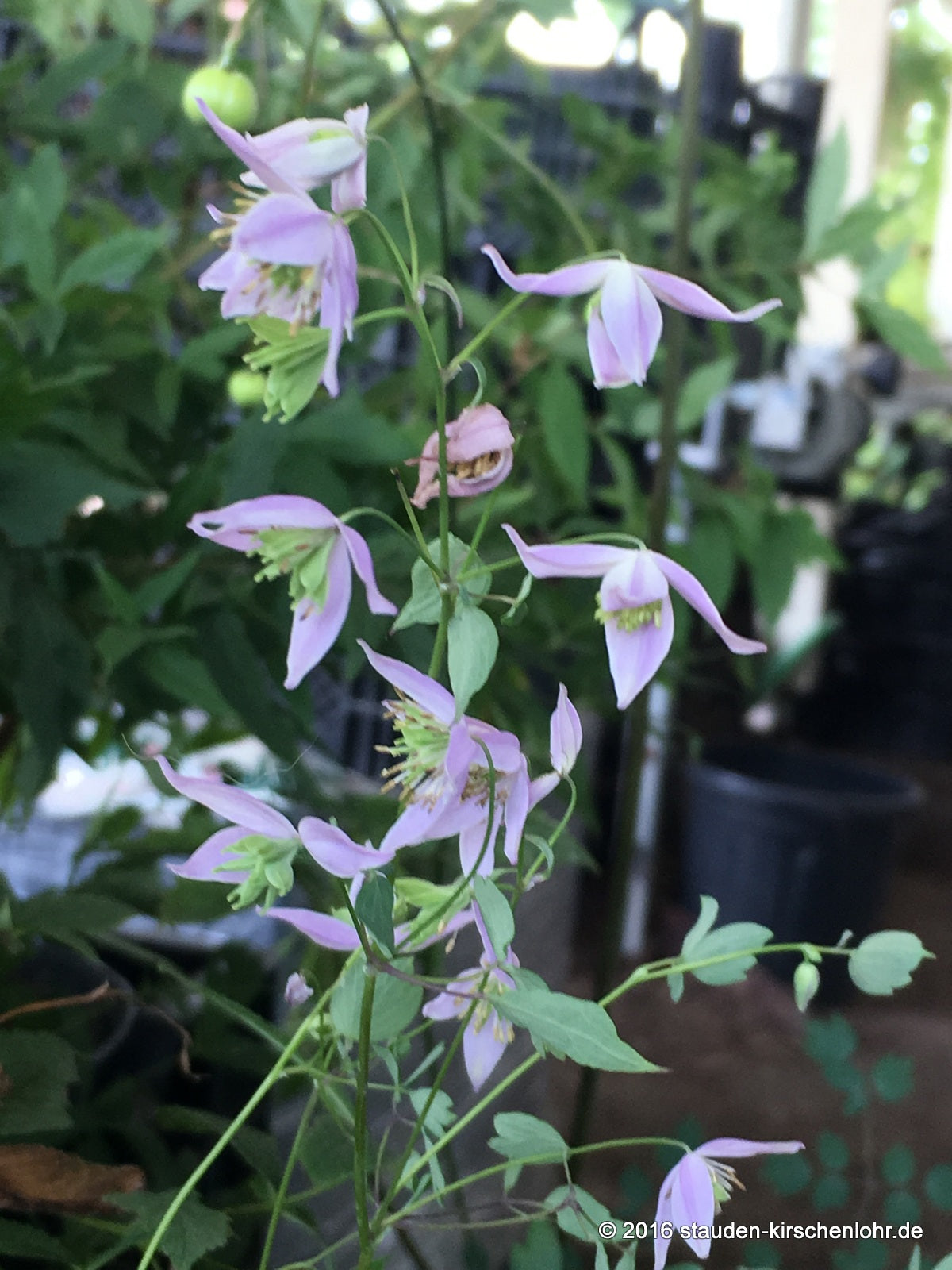 Große, hellviolette, sternförmige Blüten. Rötliche Stängel.