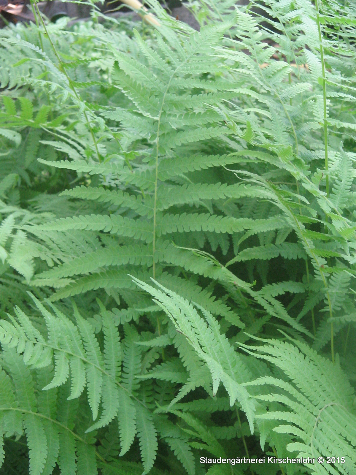 Große, einfach gefiederte, dreieckig wirkende, hellgrüne Wedel. In den USA heimisch. Liebt saure, humusreiche Böden. Extrem später Austrieb! Sommergrün.