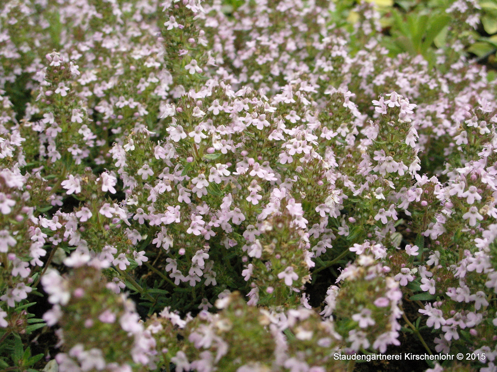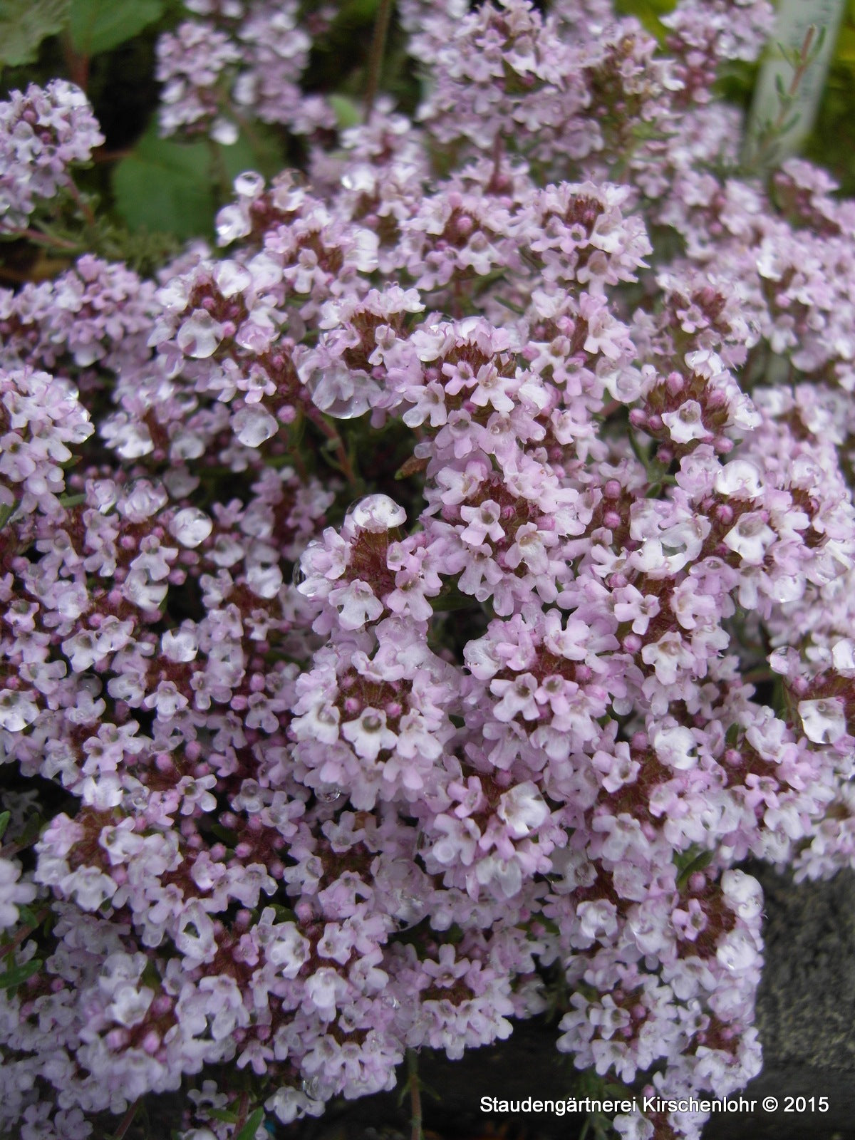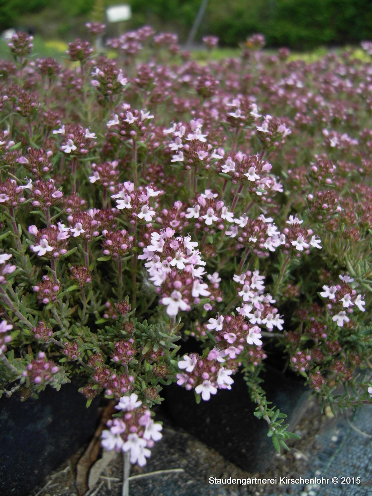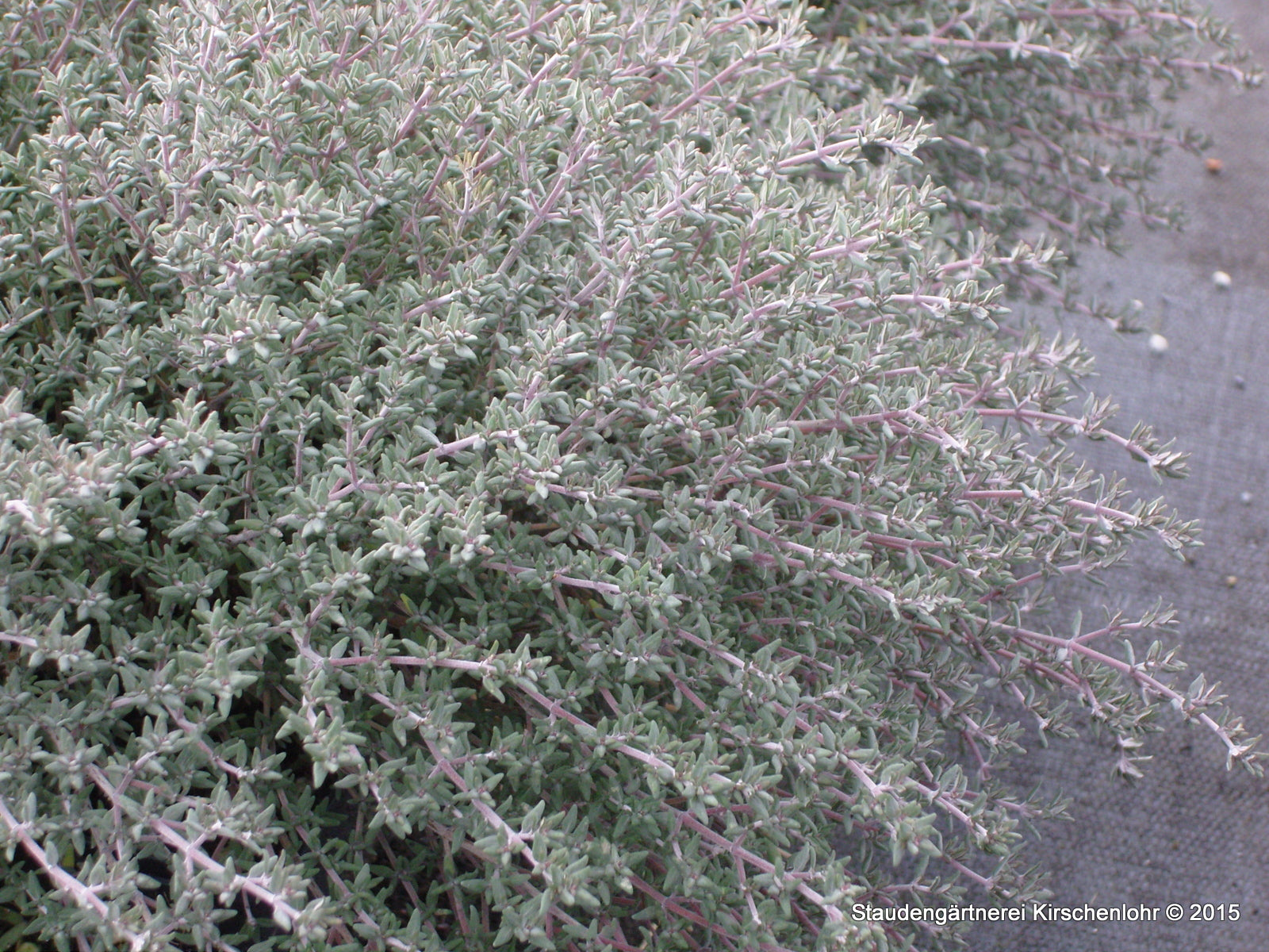 Lila-rosa Lippenblüten, etagen- bis quirlartig. Sehr reichblühend. Schmale graugrüne, nadelartige Blätter. Hervorragende Hybride zwischen T. cherlerioides und T. vulgaris. Immergüner Halbstrauch. ISU-Diplom.