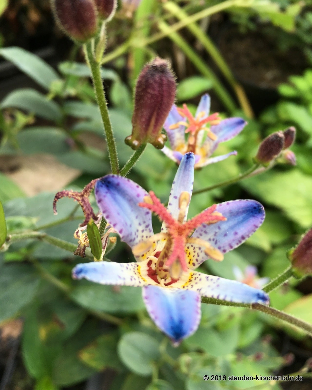 Trichterförmige, purpurrosa Blüten. Purpur bis bläulich schimmernd und punktiert. Glatte, glänzende, breitlanzettliche Blätter; ebenfalls schwach punktiert. Sommergrün. Absolut wüchsig!