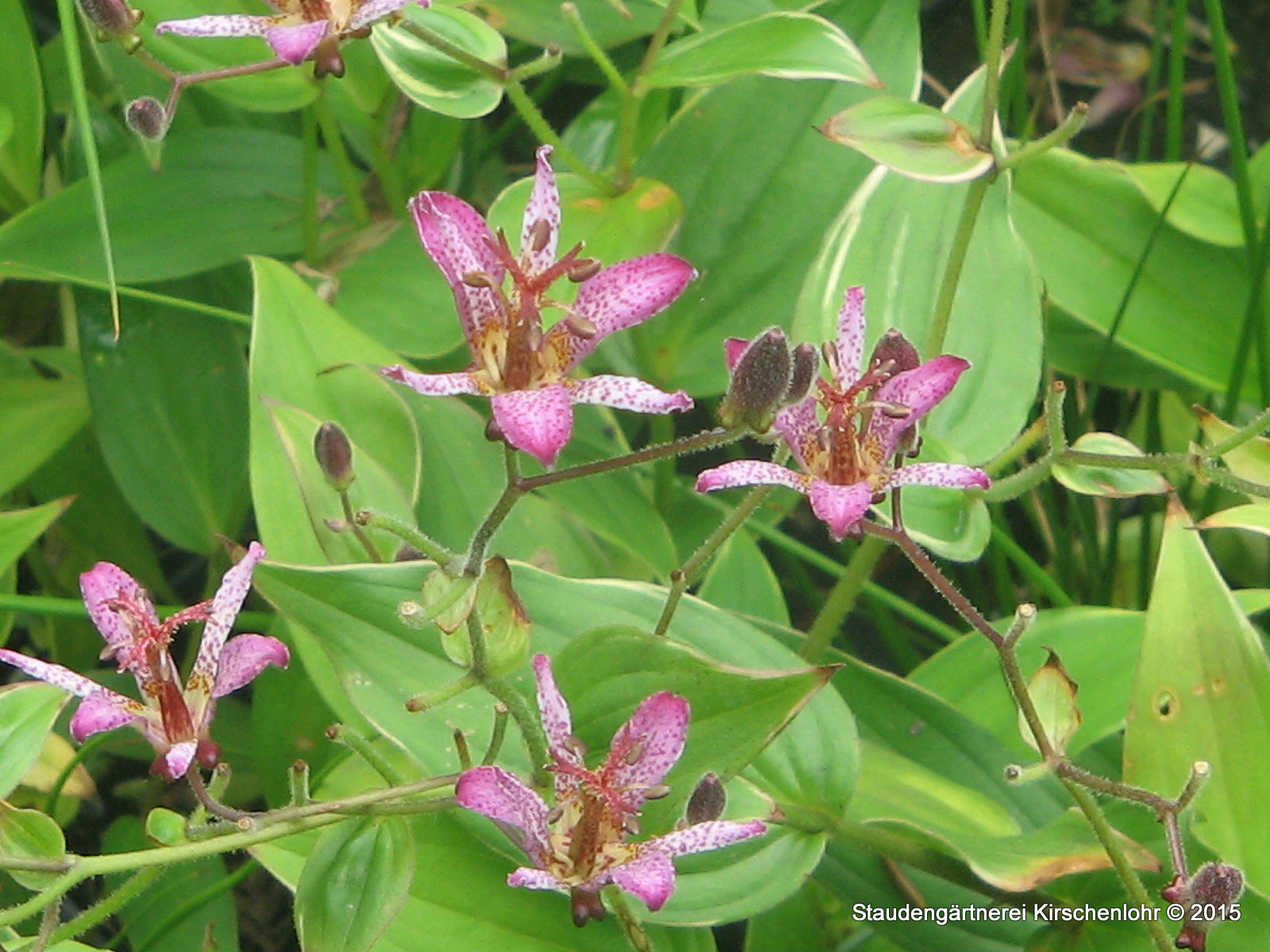 Trichterförmige, purpurrosa Blüten. 3 breitere und drei schmälere Blütenblätter. Glatte, glänzende, breitlanzettliche Blätter mit schmalem gelbem Blattrand. Sommergrün.