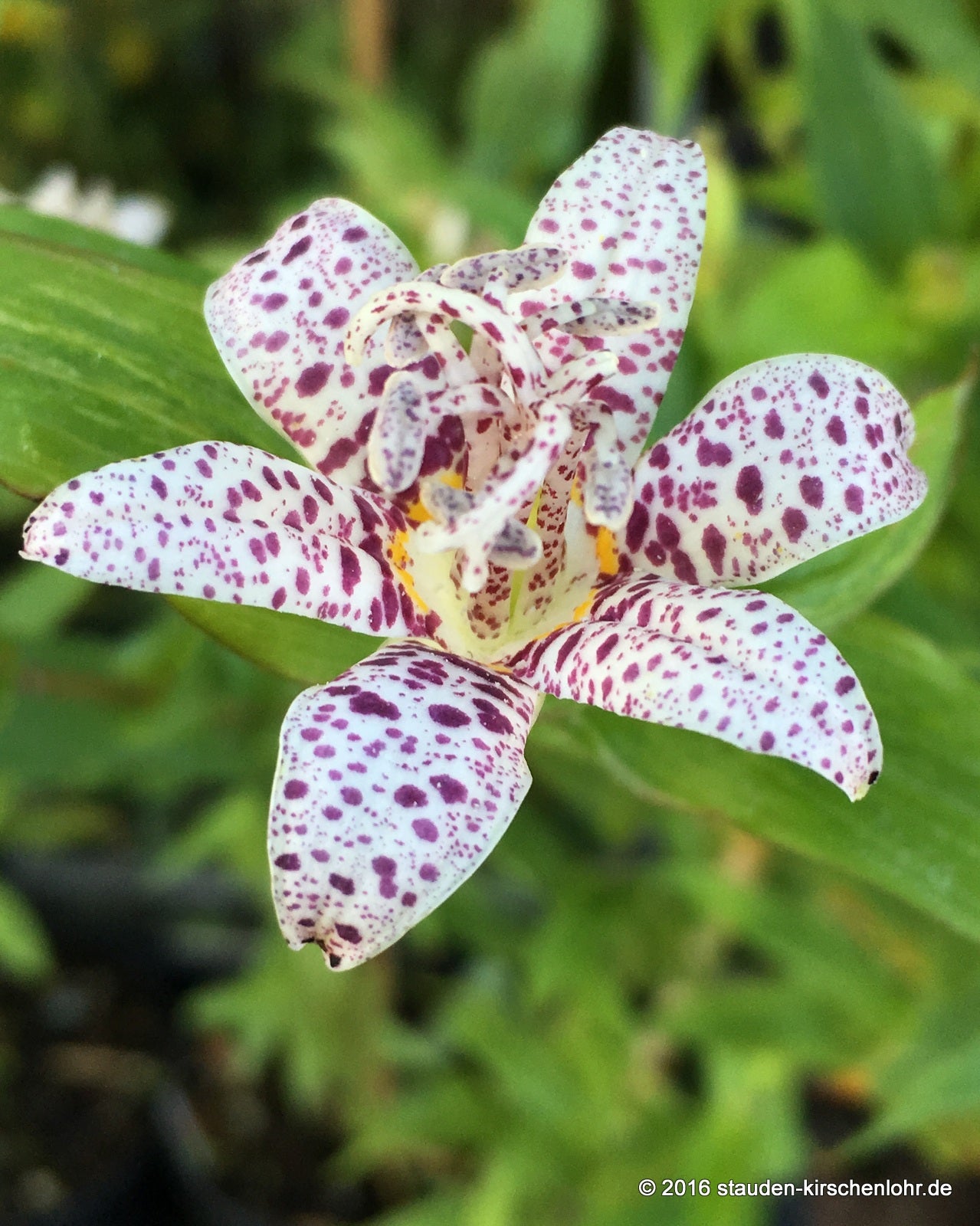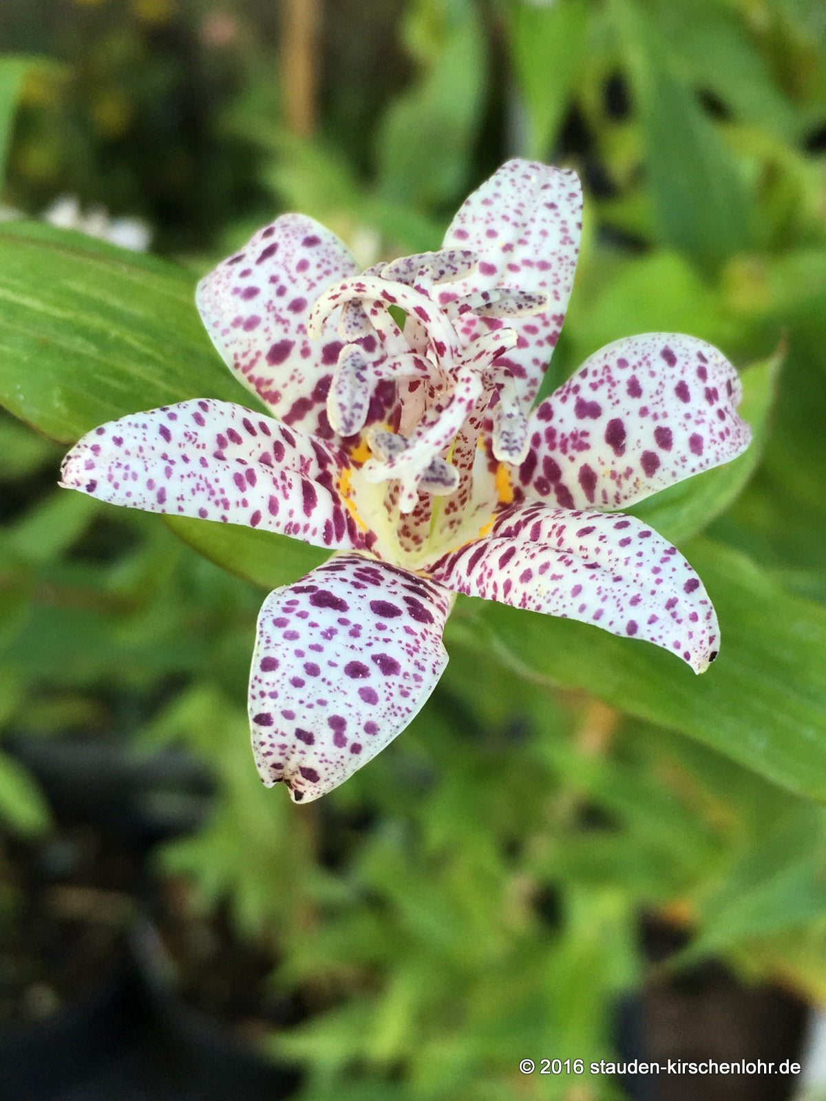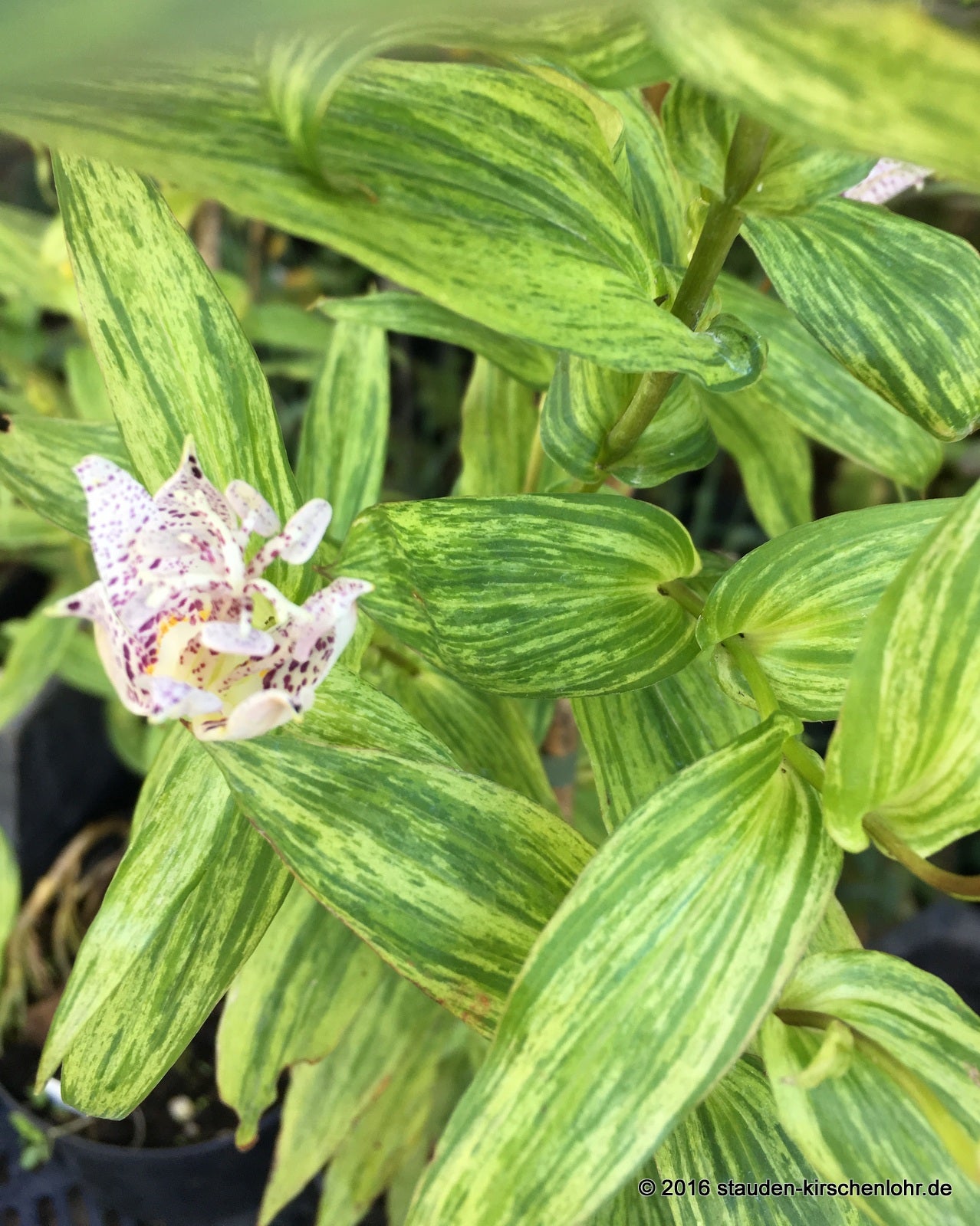 Trichterförmige, weiße Blüten mit violettroter Punktierung. Feinbehaarte, lanzettliche Blätter mit gelb-grün gestreifter Zeichnung. Schöne, farbenfrohe japanische Variation. Sommergün.