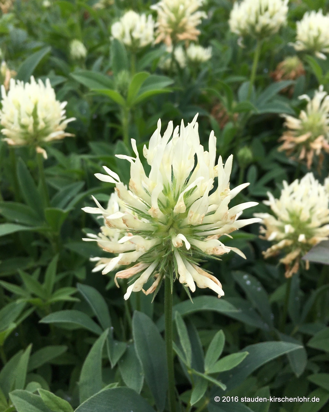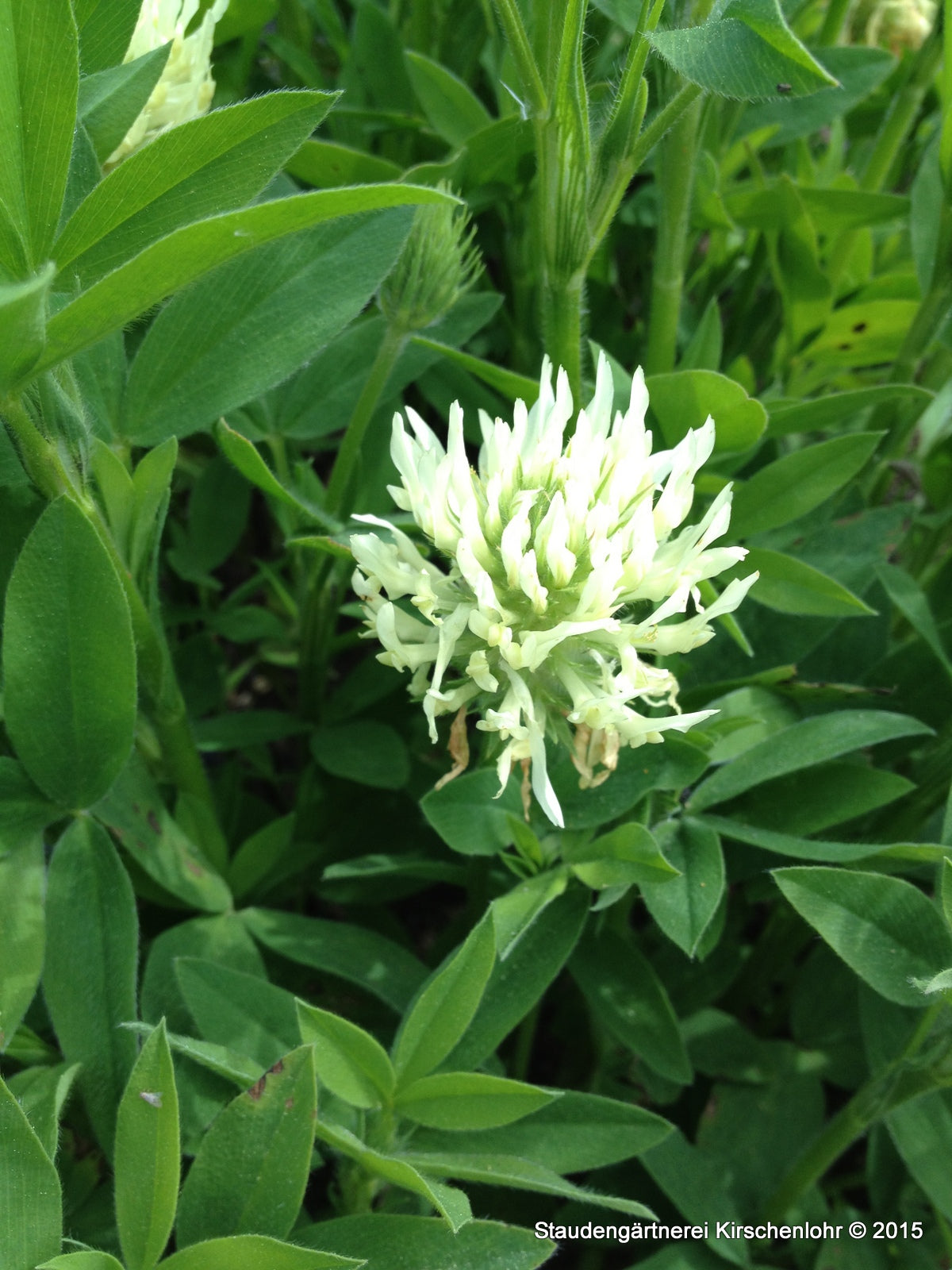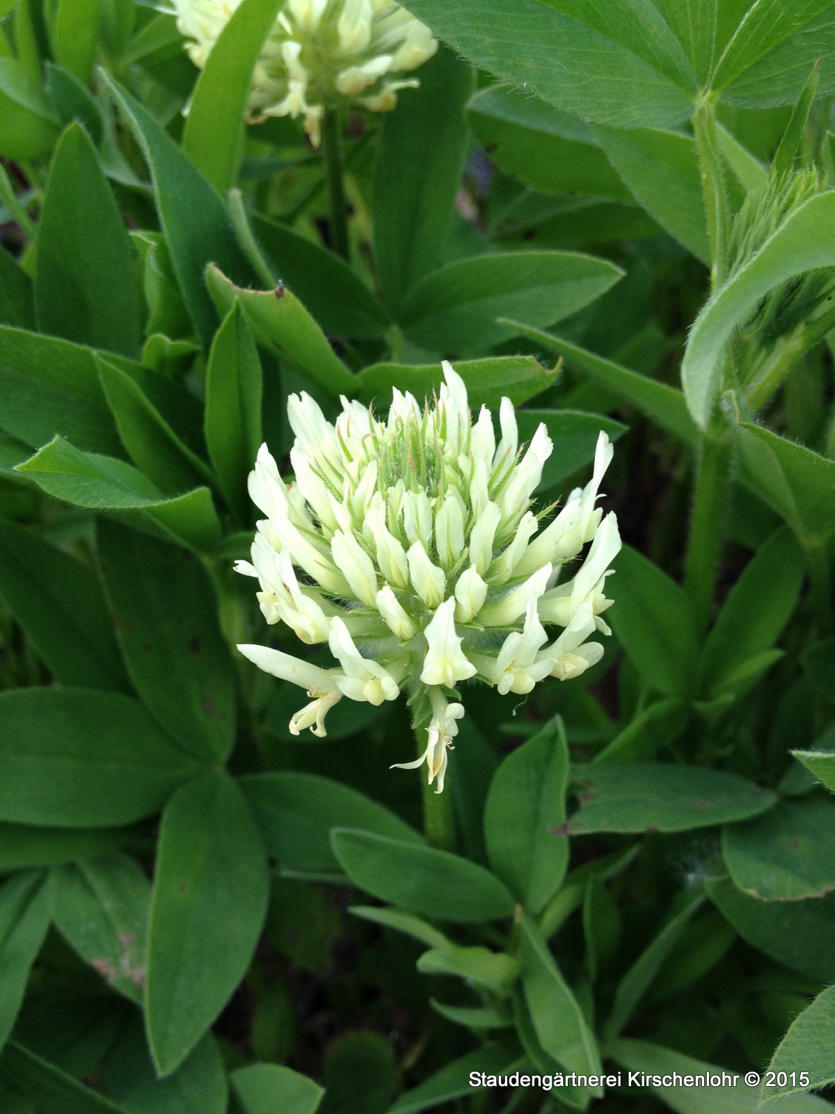 Wunderschöner Schmetterlingsblütler mit blass hellgelben Einzelblüten. Blüten in rundlichen Köpfchen. Dreiteilige, zusammengesetzte, lineallanzettliche Blätter. Sommergrün.