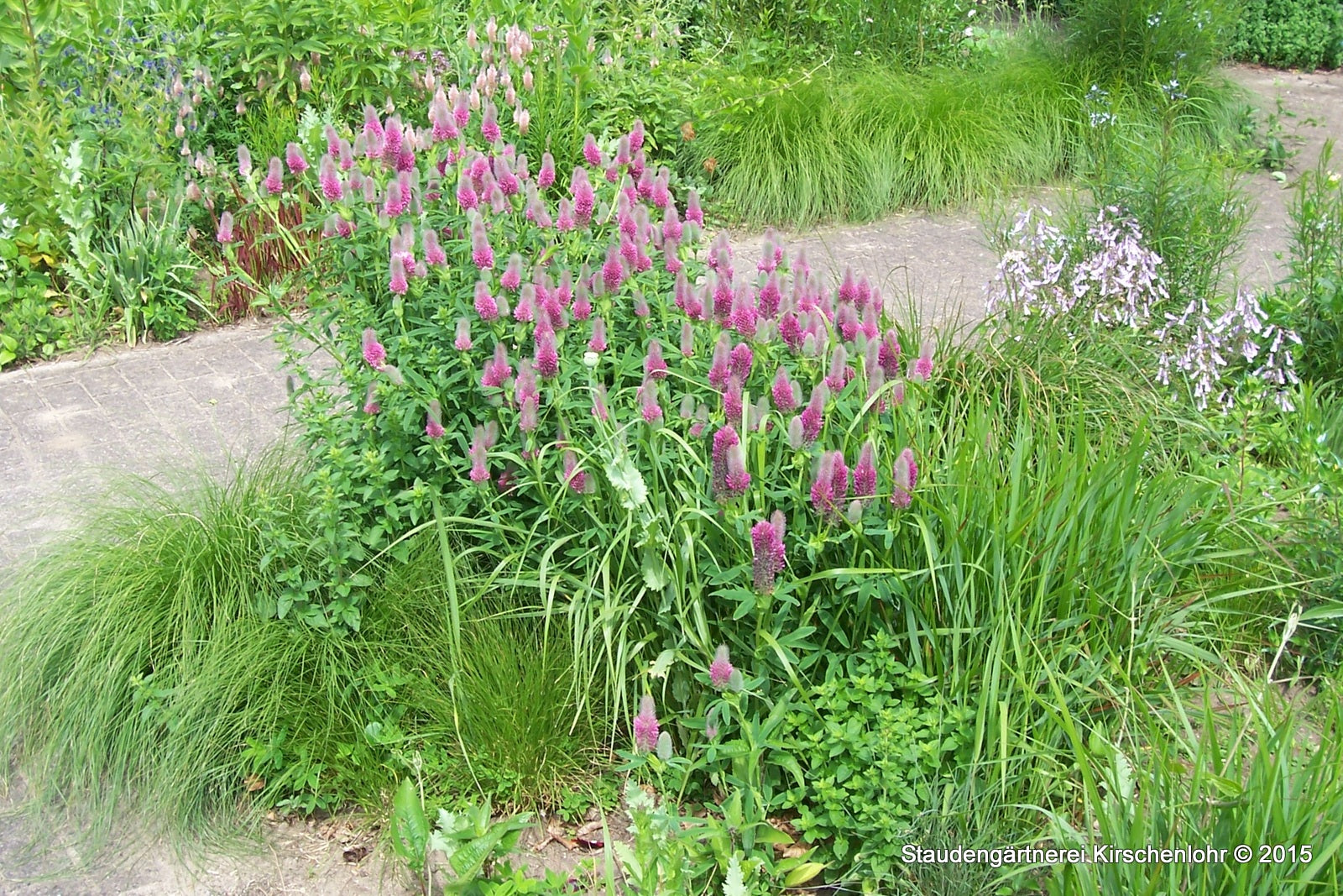 Wunderschöner Schmetterlingsblütler mit himbeerfarbenen Einzelblüten. Blüten in rundlichen Köpfchen. Dreiteilige, zusammengesetzte, lineallanzettliche bis elliptische Blätter. Sommergrün.