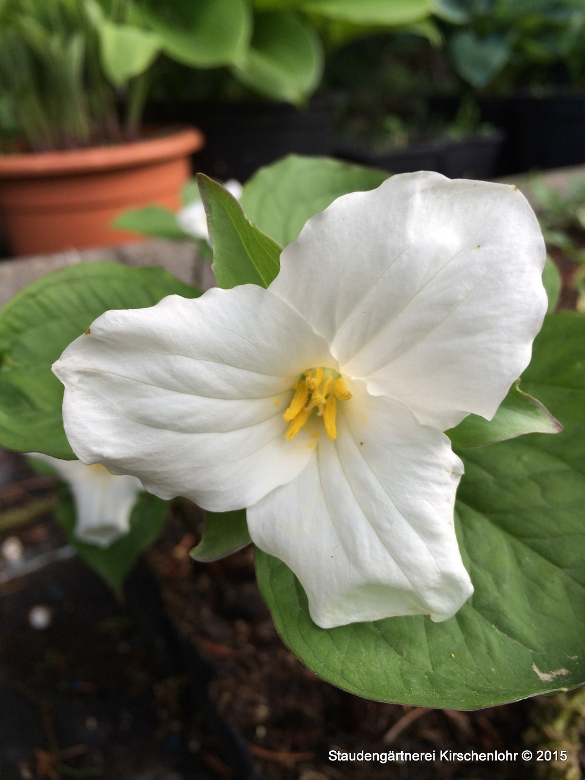 Bis 8 cm lang gestielte, stehend aufrecht oder leicht geneigte, weit geöffnete Petalen. Verkehrt eiförmige weiße Petalen. Blätter rhombisch, horizontal stehend mit straker Nervatur.