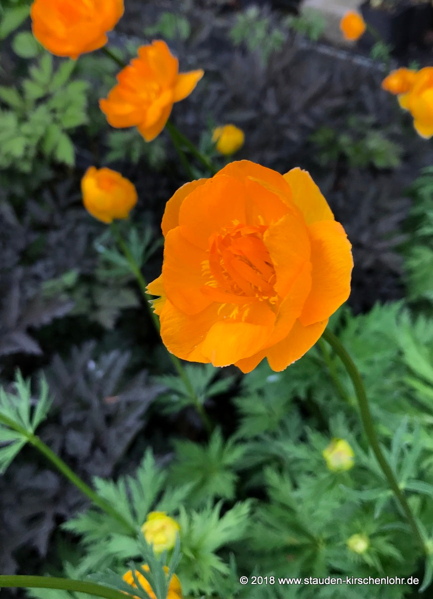 Orangegelbe, halbkugelige, nach innen geschwungene Blütenblätter. Kugelige Blüten. Rhomben- bis rautenförmige, mehrzipfelige Blätter, grob gesägt bis spitzlappig. Sommergrün.