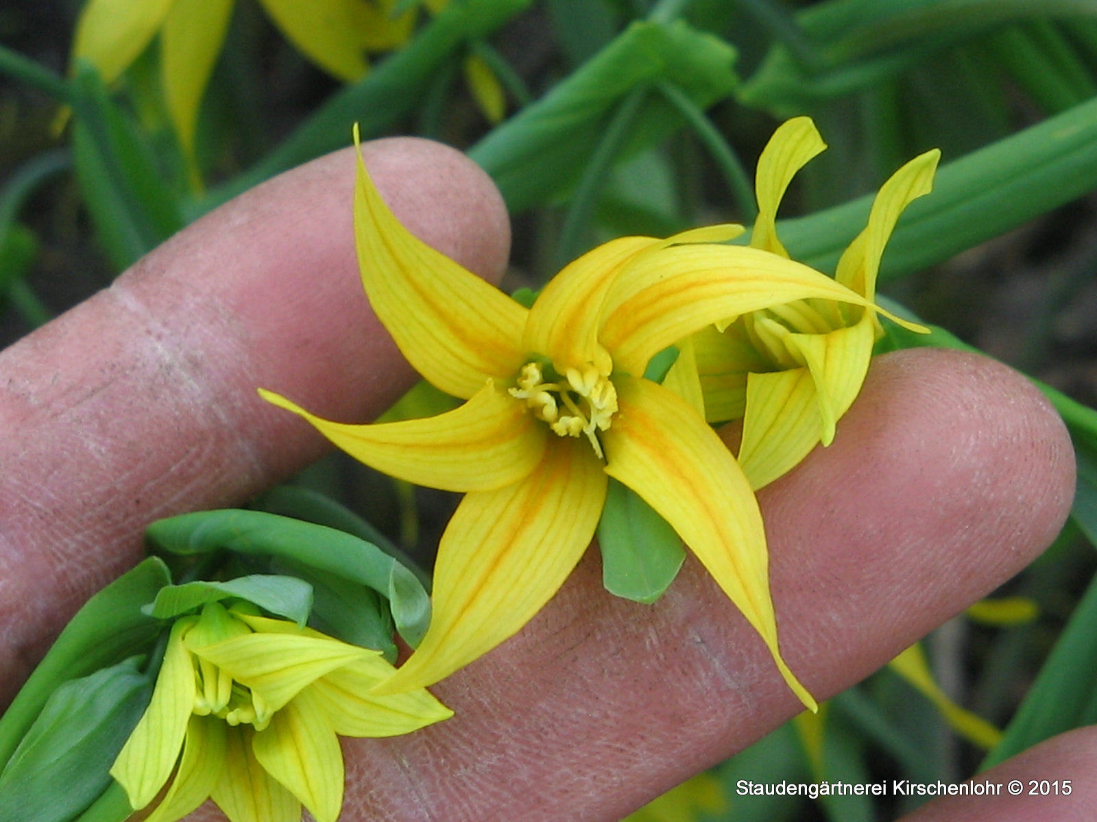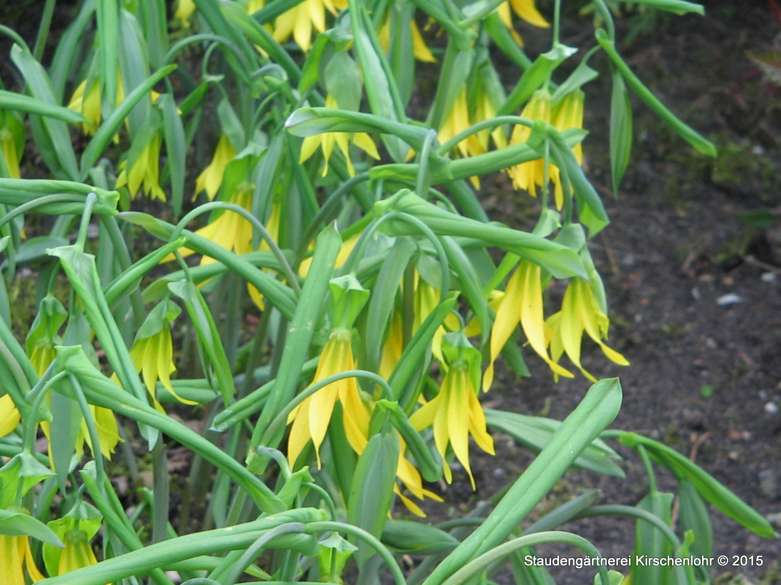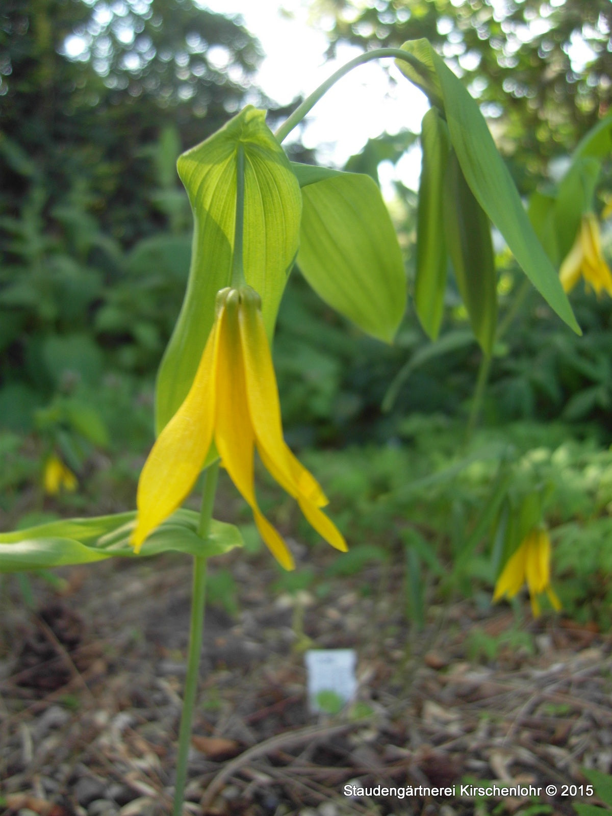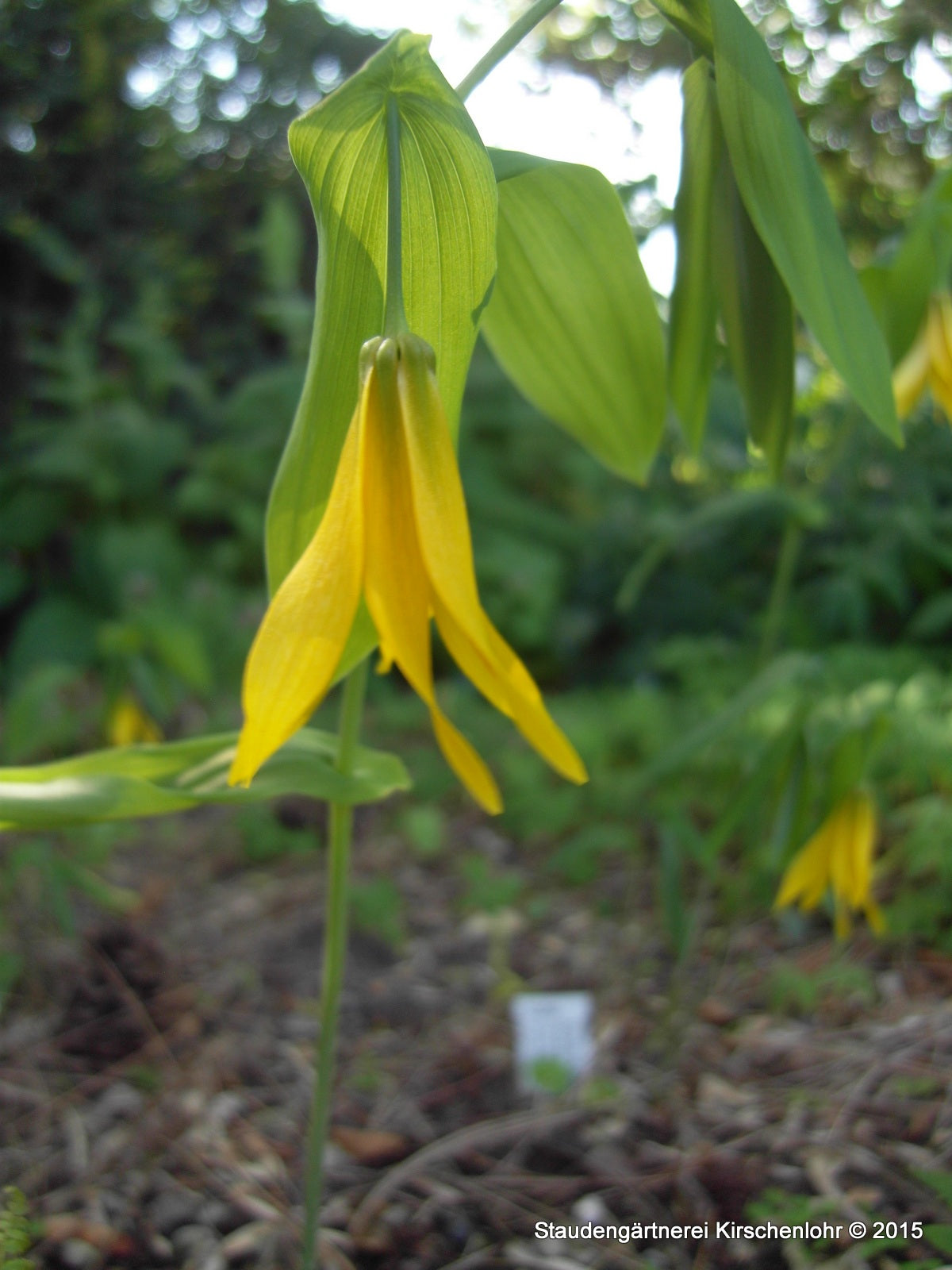 Dunkelgelbe Blüten schlank, hängend. Stängel gabelig verzweigt, beblättert, bogig. Lanzettliche Blätter, stängelumfassend, durchwachsen, unterseits fein behaart. Sommergrün.