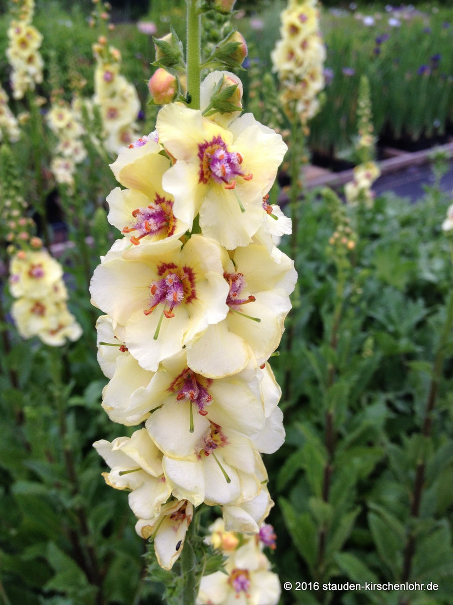 Leuchtend hellgelbe, rachenförmige Blüten mit auffällig purpurfarbenem Auge in einer verzweigten Scheinähre. Dunkelgetönte Stängel. Grüne, lanzettliche Blätter. Wintergrün.