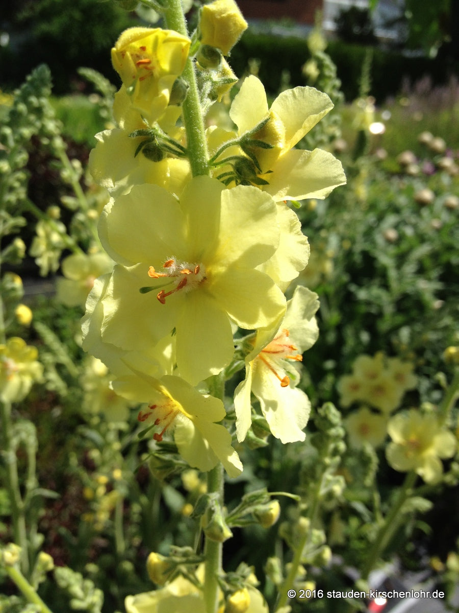 Leuchtend hellgelbe, rachenförmige Blüten in verzweigter Scheinähre. Filzige, graugrüne, lanzettliche Blätter. Wintergrün. Wunderschöner Strukturbildner.