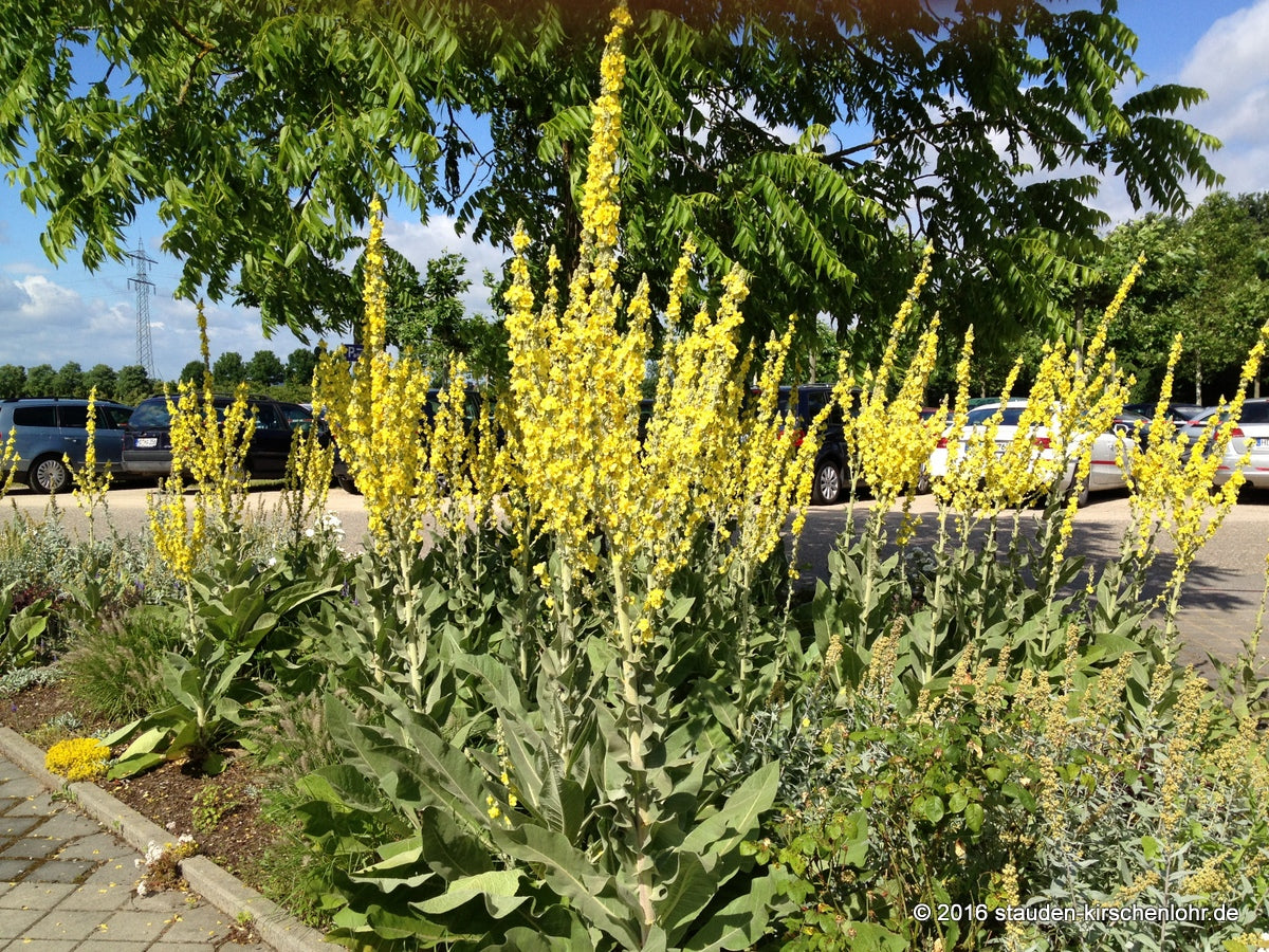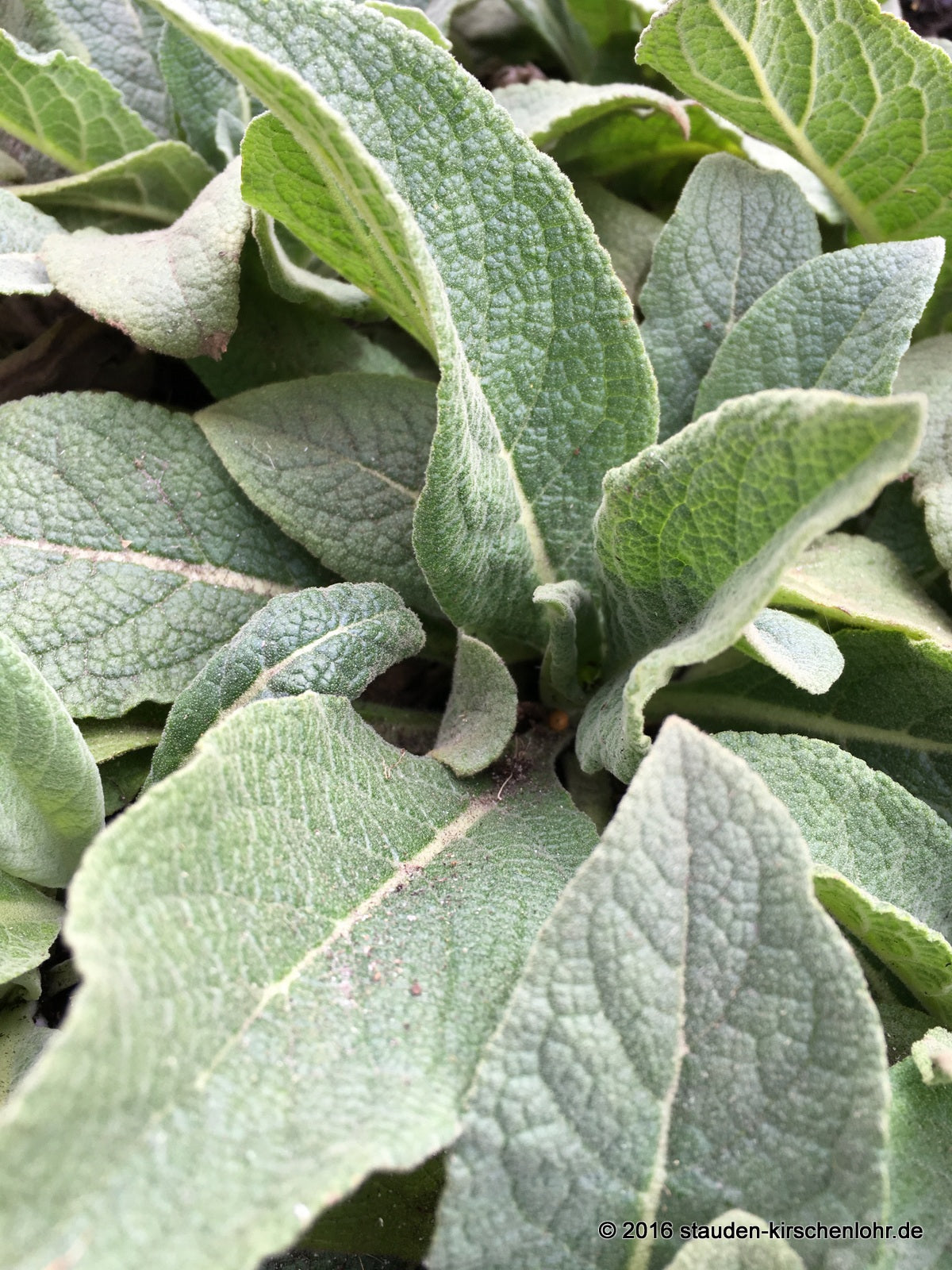 Gelbe, rachenförmigen Blüten. Gewaltiger, kandelaberartiger, rispig verzweigter Blütenstand. Rispenäste mit zahlreichen Blüten besetzt. Graugrüne Blätter in großer Rosette; ganze Pflanze filzig. Wintergrün.