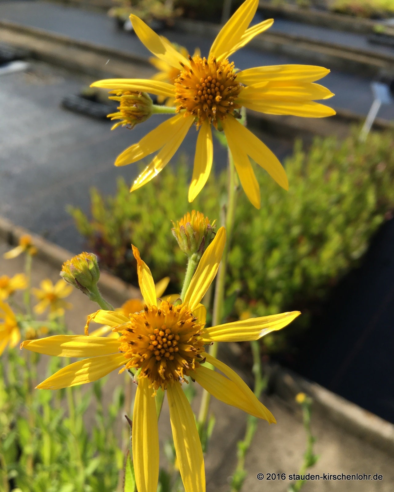 Gelbe, leicht hängende Strahlenblüten, gelbe halbkugelige Scheibe. Endständige Blüten an aufrechten Stängeln. Diese sind oben leicht doldig. Lanzettliche Blätter mit leicht gesägtem Blattrand. Sommergrün.