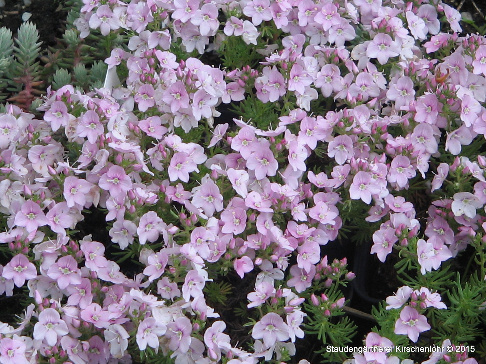 Reichblütige, rosa Blühende Selektion mit traubig angeordnetem Blütenstand. Nadelartige Blätter. Polsterbildend. Sommergrün.