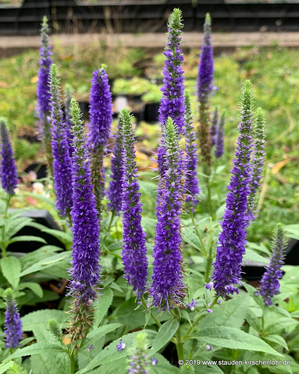 Dichte, straff aufrechtwachsende, tintenblaue, verzweigte Scheinähren. Lanzettliche, grüne Blätter mit gesägtem Rand. Kompaktwachsend.