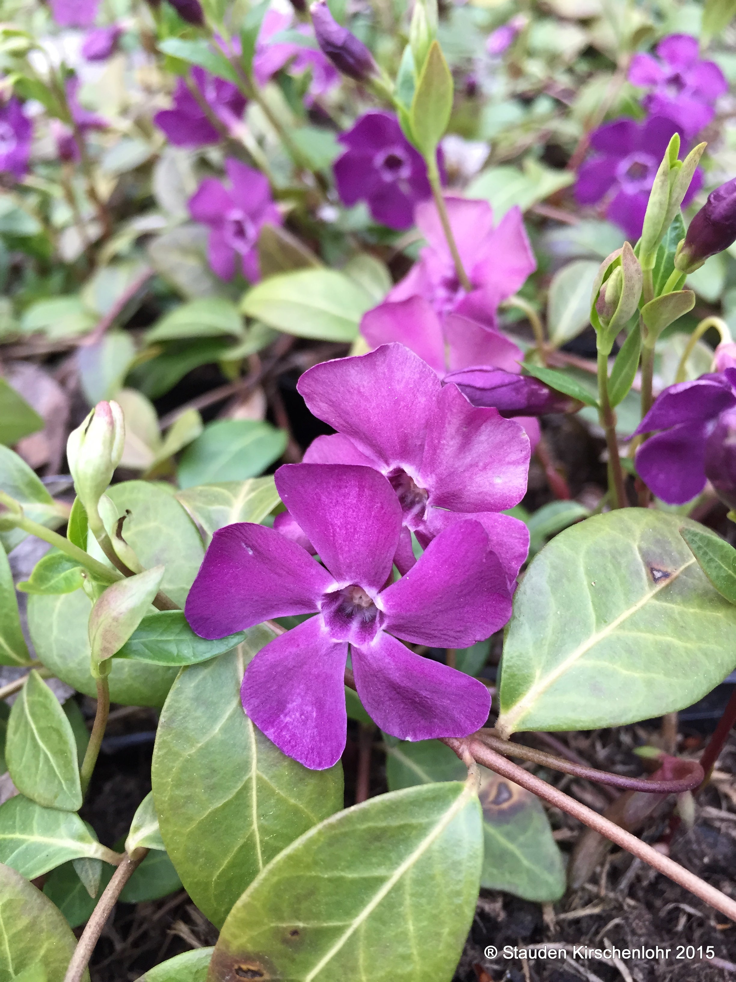 Purpurlila, kronröhrige Blüten. Die Blüten sind einzeln, kurz gestielt in den Blattachseln. Ovale Blätter an niederliegenden Trieben. Wichtiger, robuster Flächendecker. Wintergrün.