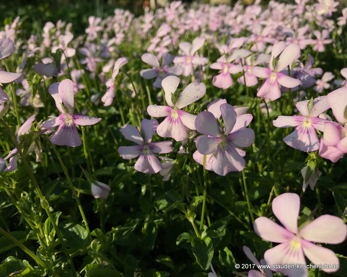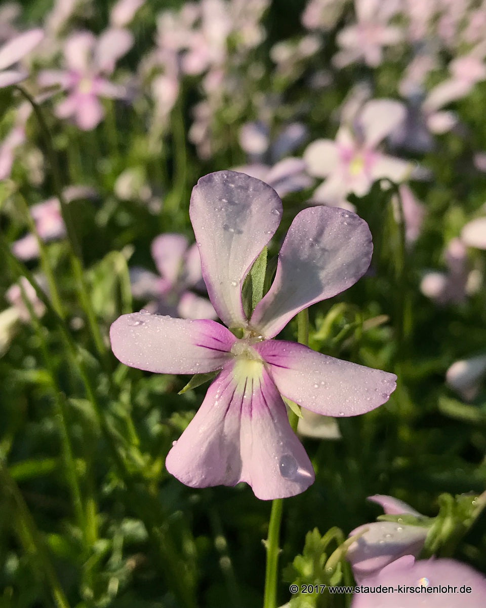 Zart fliederrosa Blüten. Diese sind hochgestreckt bis rundlich. Blütenblätter freistehend; Auge fast weiß. Dunkel geadert.Grüne Blätter, eiförmig gekerbt. (vegetativ vermehrt!)