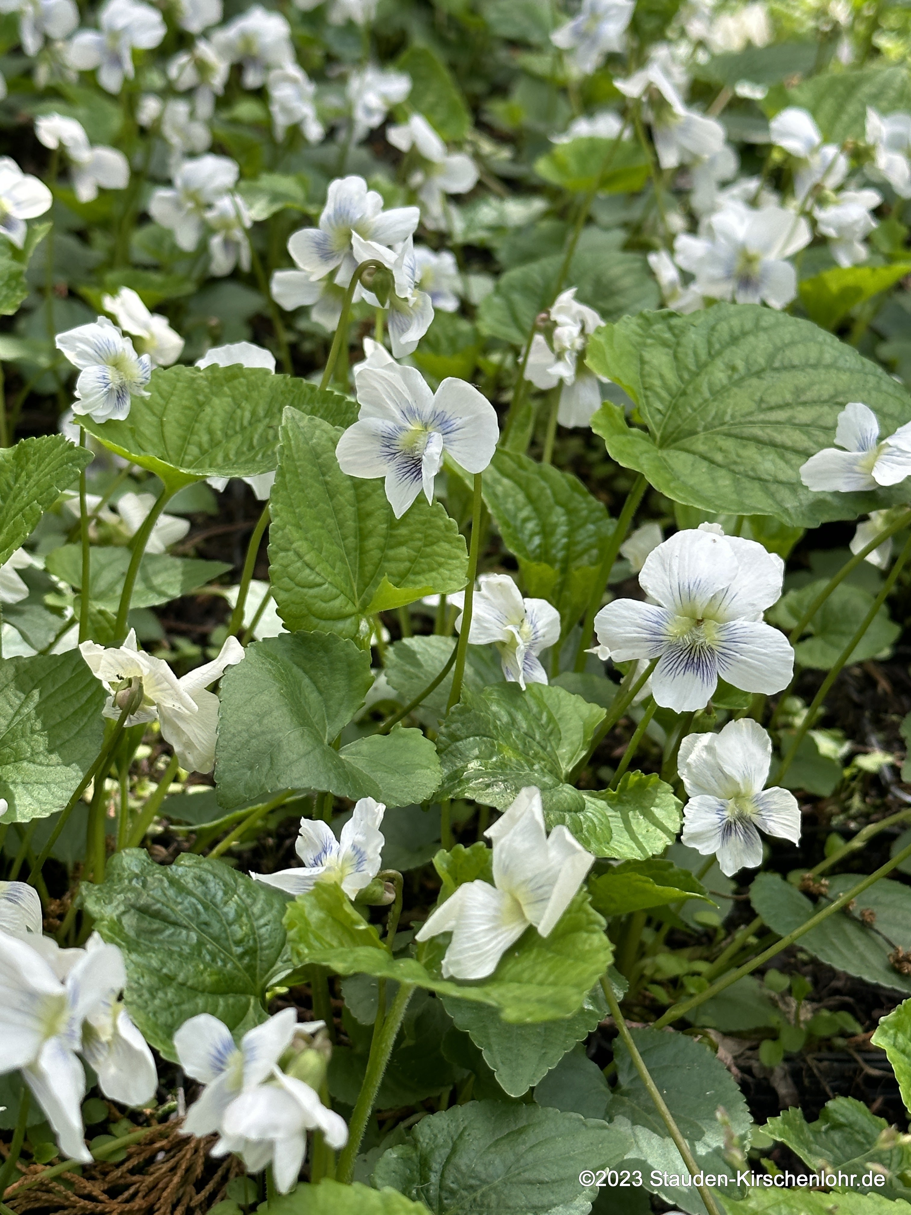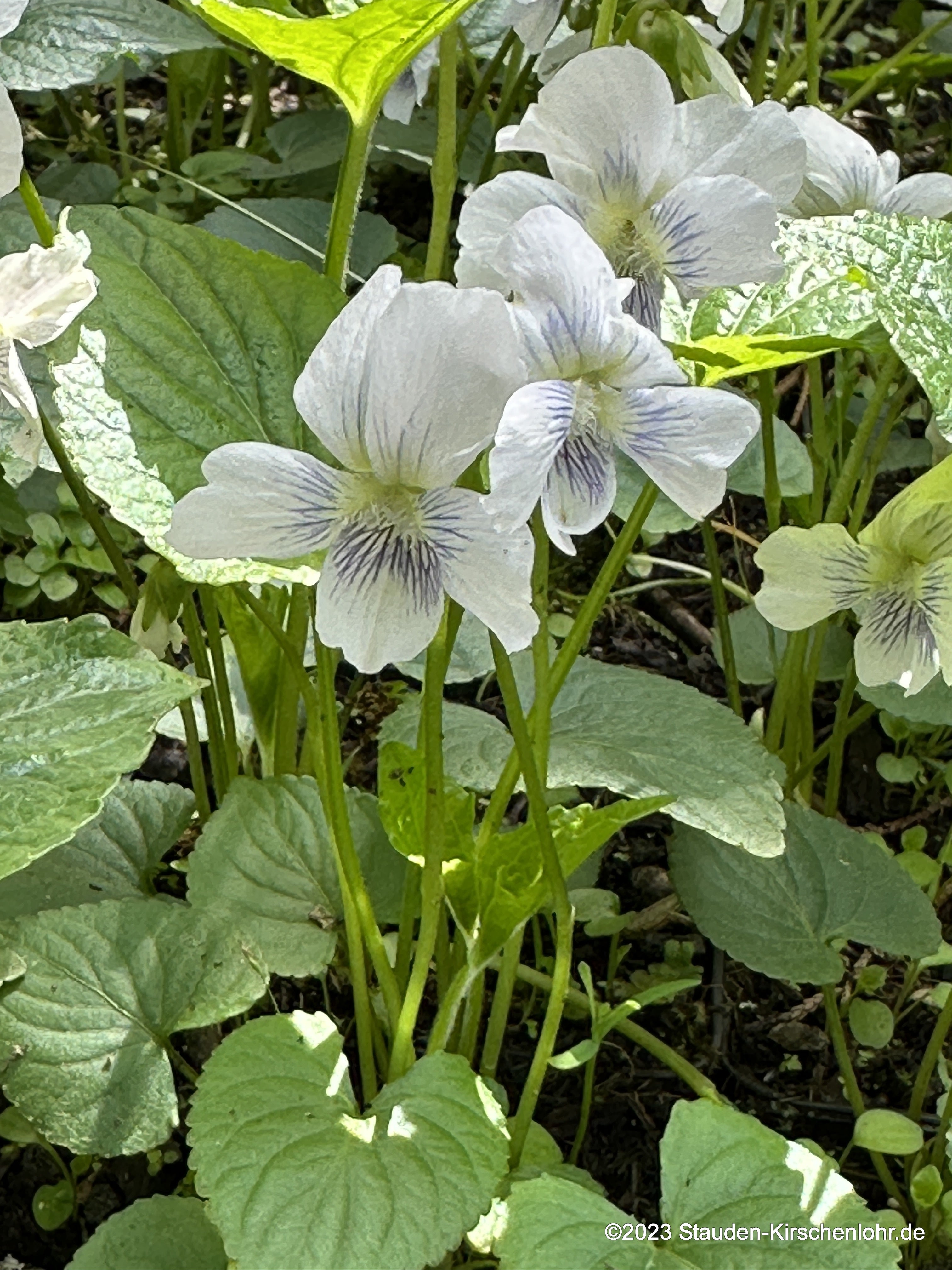 Weiße Blüten mit deutlichen violettblauer Augenzone und Adern. Blätter breit ei- bis herzförmig, Blattrand gekerbt. Sommergrün.